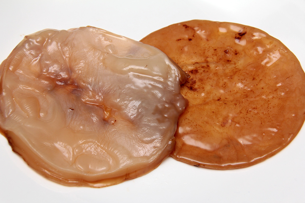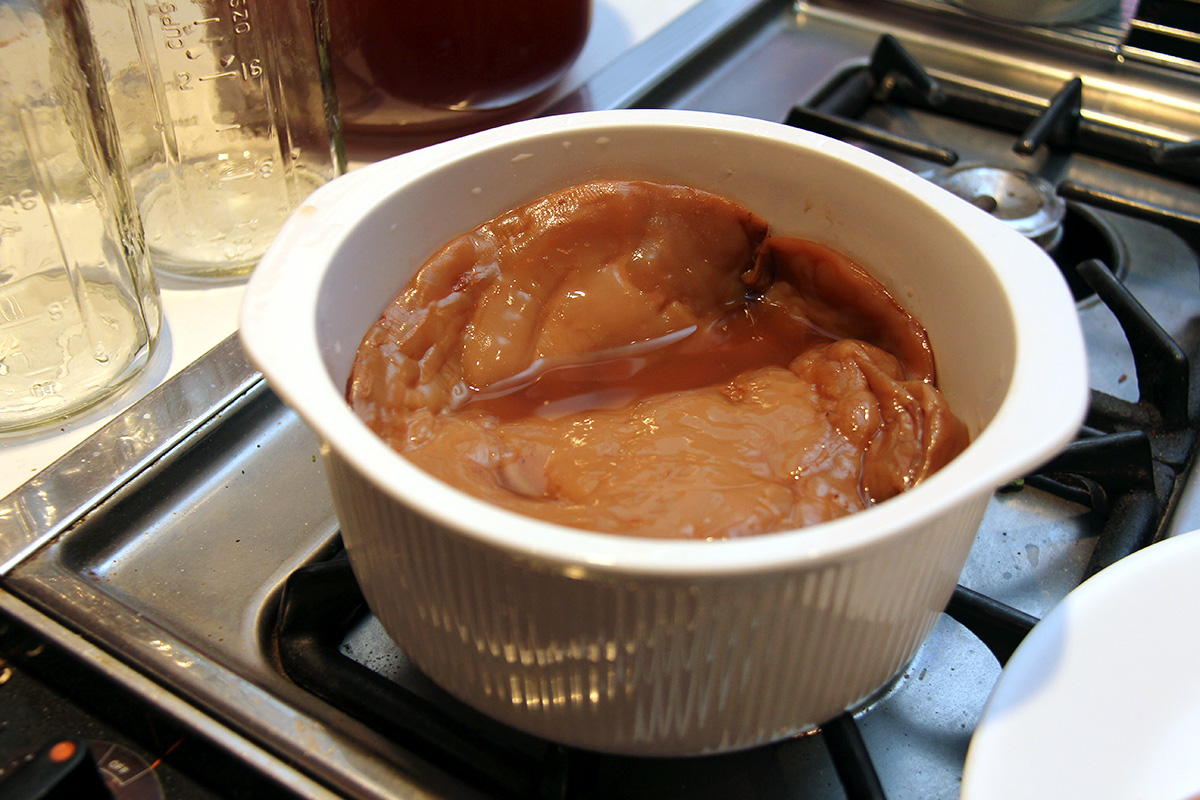 out of the 5L jar i fished out all the scobies. there was a new scoby a few weeks ago, but trapped CO2 had pushed it almost out of the jar, and when i went to go push it down, it was so slippery that it slid to the slide of the jar and i didn't want to fish it out. instead i just let the kombucha form a new scoby. this newest scoby is much healthier looking but not as thick as i'd like to see. i put the scobies into a ceramic bowl and put the bowl covered into the fridge. that probably wasn't idea, next time i think i'll just leave out the scobies soaking in starter tea, just to keep the bacteria from becoming dormant.