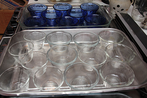 i've got a tray of 8 blue ramekins, a tray of 13 clear ramekins (8x 6 oz. and 5x 5 oz.), and a tray of 6 ceramic ramekins (4x 6 oz. and 2x 5 oz.). the size of the ramekins doesn't make a lot of difference since i can fit the same amount of liquids regardless if it's 6 oz. or 5 oz. the 6 ceramic ramekins i'll give to my godmother and her sons since they won't be celebrating thanksgiving at my parents' place this year. the smaller 5 oz. pyrex ramekins i'll give to priscilla. but in total i'm looking to make 27 containers of flan this season, probably the most i've ever made at one time.