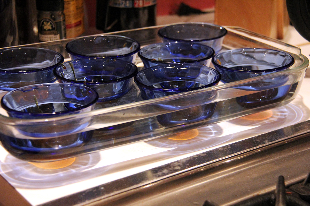 i boiled some water for the water baths. basically a kettle of water per bath. i used a metal teapot for one, and the electric kettle for the other. i usually like the ramekins sitting in a hot bath before i pour in the caramel layer.