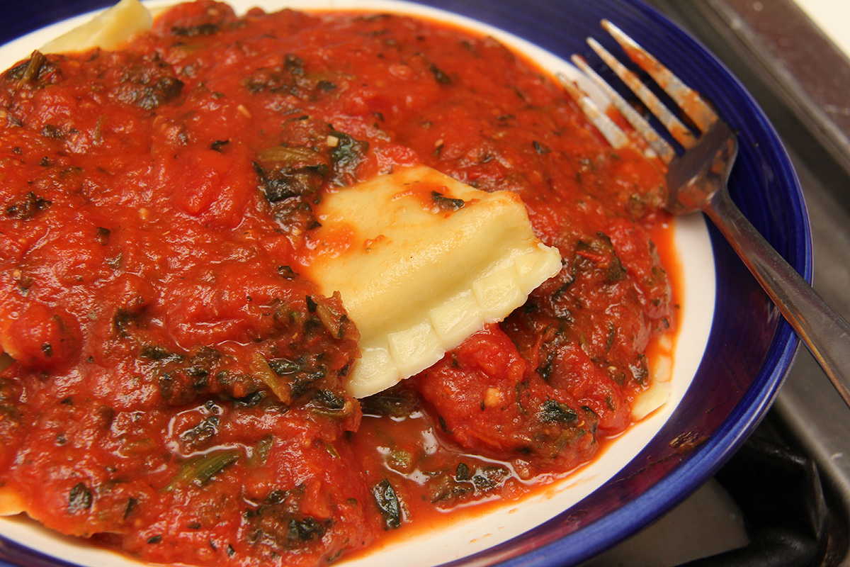 with nothing left to do but to wait for the final batch of flan to finish baking, i could finally make some dinner. i had some chicken mozzarella raviolis that i boiled, combined with a simple tomato sauce added with some loose frozen spinach. i finally sat down in the living room to eat around 8:40.