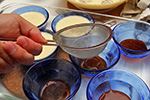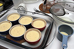 after the caramel layer comes the pouring of the flan mixture. i use a mesh strainer to catch any lumpy bits of eggs. i was afraid the strainer would filter out the vanilla bits but they seemed to pass through without any problems. the straining isn't necessary, but i like to do it as an additional step, i think it gives a more even flan. it's kind of fun because i can hear the hot caramel crackling sometimes when the cold flan mixture is poured in the ramekins. and all the while the oven (preheating at 350°) is humming, ready to accept the baking pans.