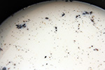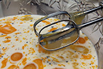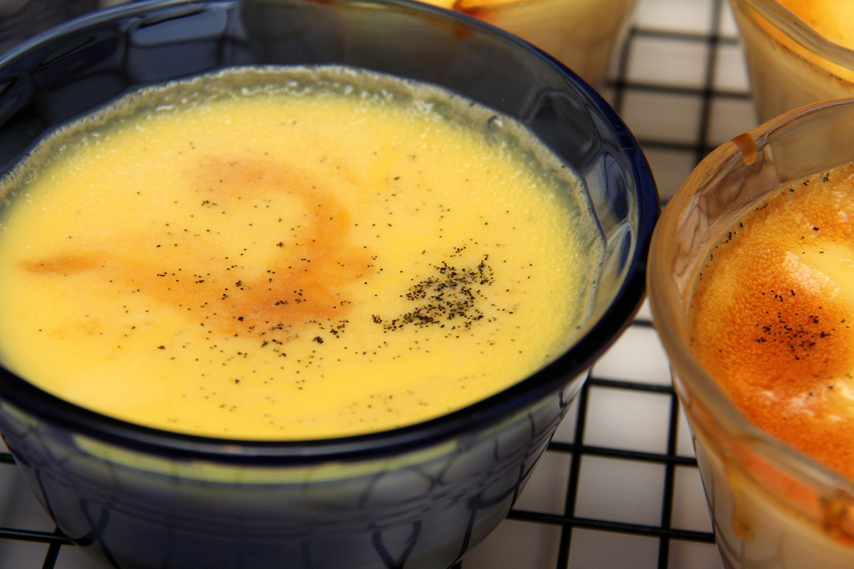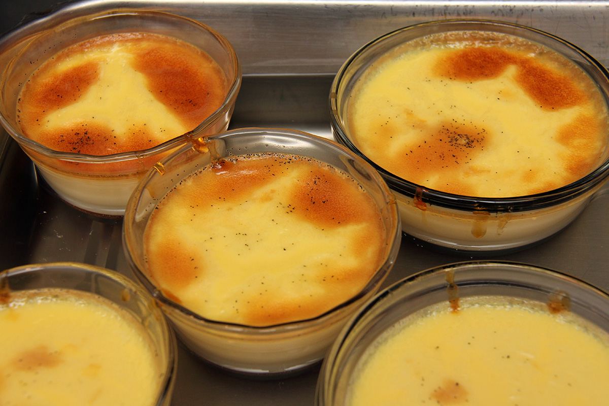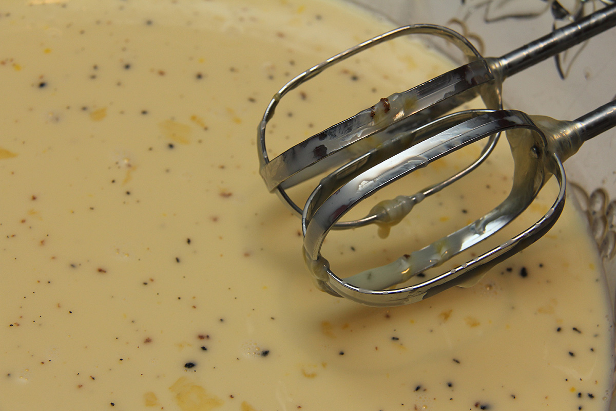 the key with mixing is to not create too much froth. bubbles in the mix will leave unsightly bubbles in the flan. 17 eggs took a while to beat until finally i had a nice consistent yellow flan mixture with sprinkles of black vanilla seeds (they look like peppers). i gave the mixture some 20 minutes to settle before continuing on to the next step.
