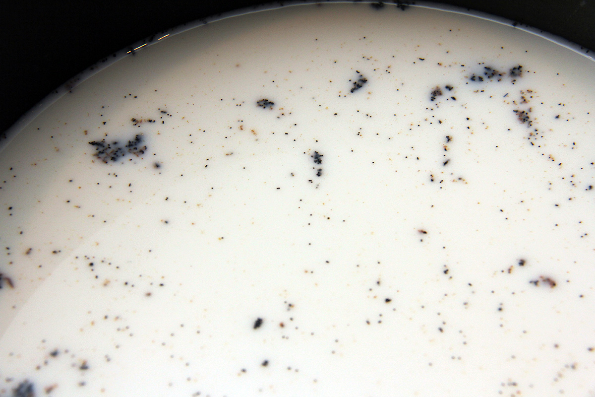 the thing with vanilla beans is they prefer a warm medium to infuse out the flavors. taking a cue from the last time i used real beans, i scraped out the paste from one bean and added it to 3 cups of warm milk simmering on the stove. as for how many beans to use, i estimated that maybe one inch of bean equals a teaspoon of vanilla extract, so that gave me an equivalent of 6-8 tsp of extract.