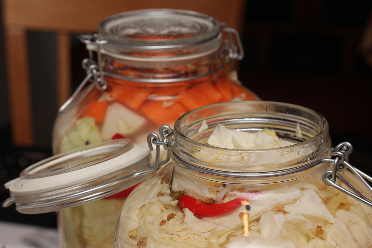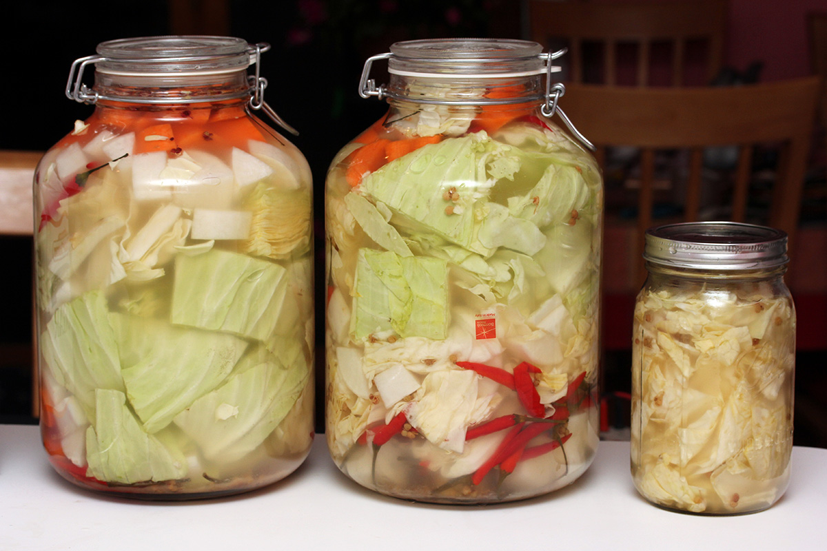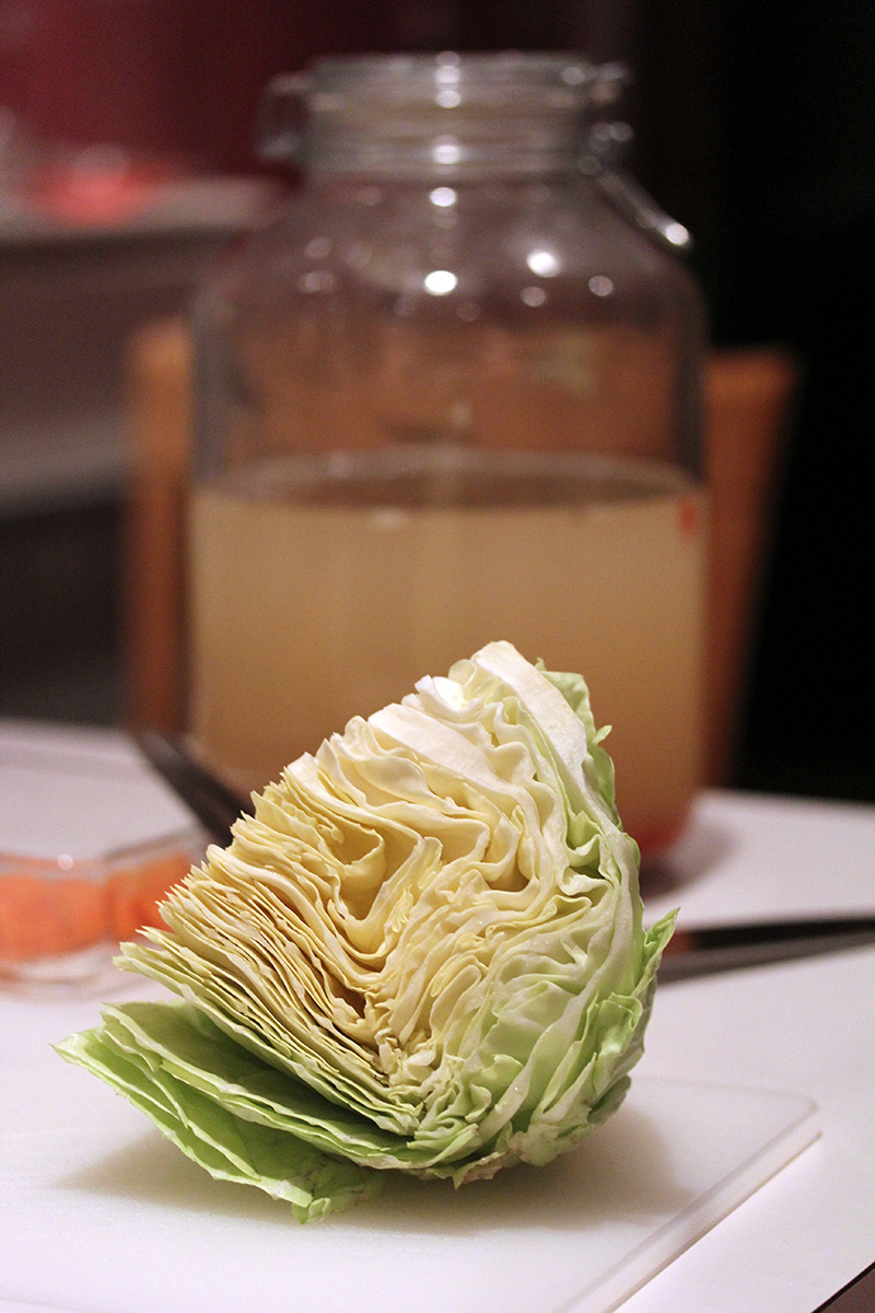 my father also dropped off some vegetables to be pickled as sichuan paocai when he was here this afternoon. earlier i washed the cabbage and quartered them. by now they were dried so it was time to put them into the paocai jar. i filled the one empty jar, and decided to remove some paocai from the second fermenting jar so i could add some raw ingredients. i made a mistake adding the new ingredients to the top because now i can't get to the old paocai at the bottom. the old paocai from the second jar wasn't that good though, tasted too sweet and the cabbage leaves were soft instead of crispy. maybe they needed more time to ferment, like the jar i had for thanksgiving, which had been fermenting for 17 days.