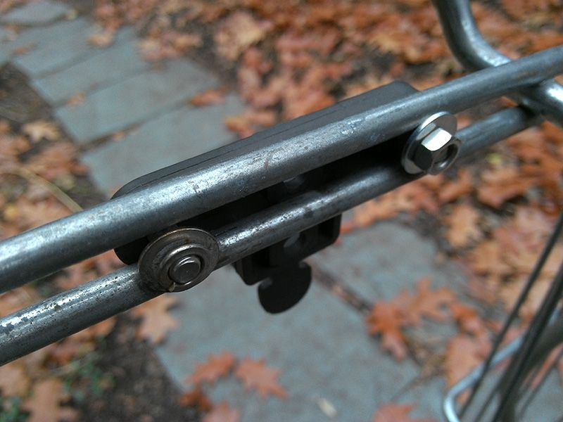 back at home again, i stowed my bike in the basement (raining this evening), but not before reattaching the rear light bracket. i replaced the washers on the screws with some larger ones, but i ended up not being able to use the split washers, so i'll have to keep my ones on them to make sure the nuts don't vibrate off over time. afterwards i raked some leaves in the backyard and put them outside for the garden refuse collectors tomorrow morning.