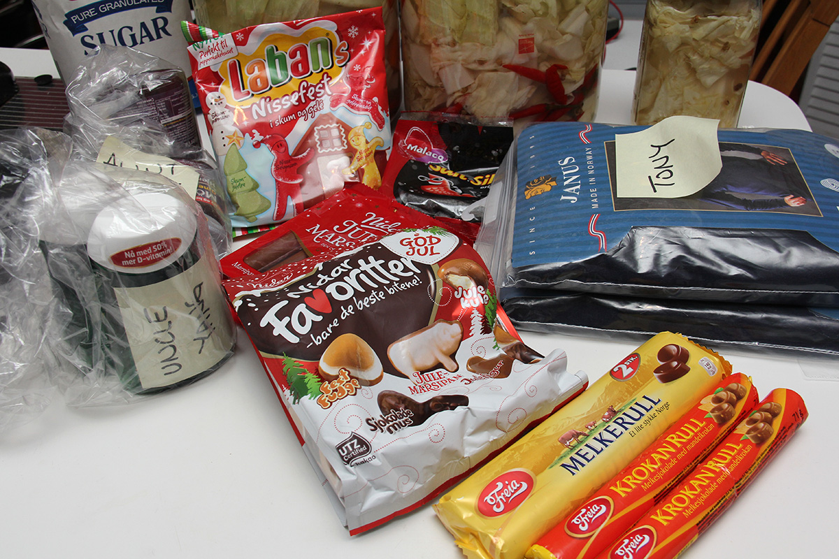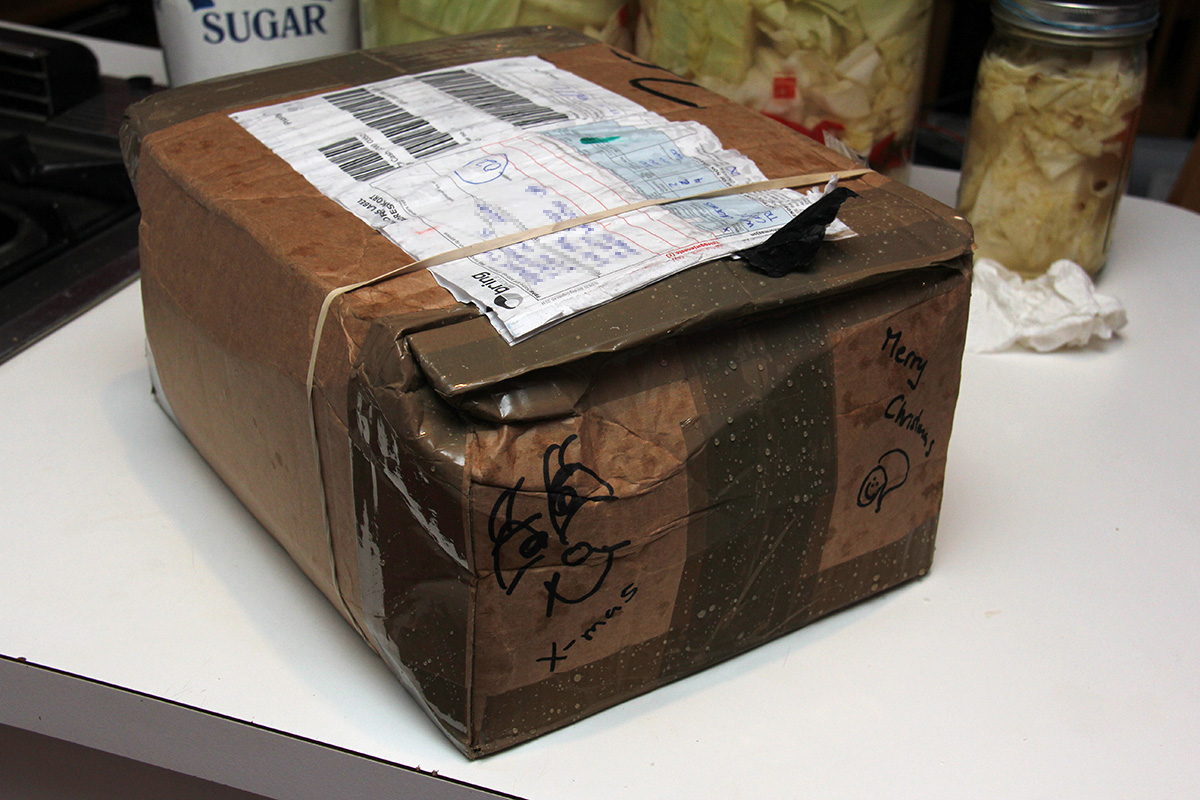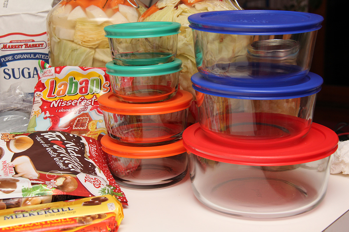 in the early evening a whole bunch of packages arrived. frances' norwegian christmas surprise showed up, stuffed with norwegian snacks, a set of merino wool thermal underwear, and some presents for my parents (who helped with the norwegian deliveries while i was away for a year in china). that was followed by my set of pyrex bowls and a new 4TB USB 3.0 external hard drive. the glassware and hard drive have rebate fulfillments and i quickly took the time to fill out the necessary paperwork to get those done.