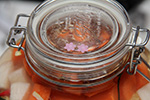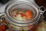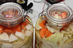 then i've got my sichuan paocai, i finally labeled them (with flower stickers) so i can keep track of which is which. jar 1 is the one that has half new cabbage and half old cabbage (fermenting for 12 days). the liquids in jar 1 isn't as sour and leaning more towards sweet. also the cabbage isn't as crisp, leaning more towards the soggy side. jar 2 is the jar i opened for thanksgiving, with paocai that'd been fermenting for 17 days. the vegetables inside are all new.
