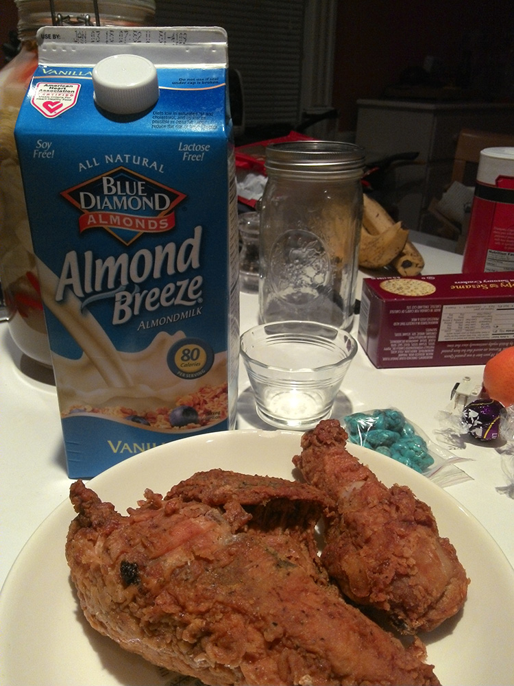 as my gum is still healing from the tooth extraction, my dentist told me i couldn't drink anything carbonated. that even rules out seltzer water, my usual favorite if i want something cold and refreshing. i ended up going to star market and buying a carton of almond milk on sale ($2.99). i've never had almond milk before, it's actually not too bad. i drank that while having the rest of my leftover fried chicken for dinner.