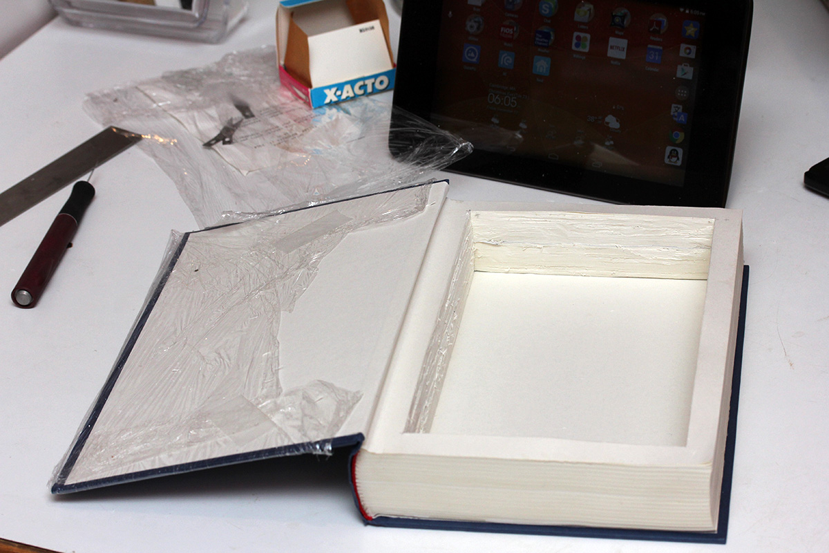 i finally finished the hollow book i'm giving my sister as a belated birthday present. i was very careful with the cutting, going through a total of 4 x-acto knife blades. i also starting cutting from the back as soon as i reached the midway point of the book, so it'd finally meet in the center. it took me just little over an hour to cut through final half the book, so i wonder why it took me so long to get through the first half? i glue-sealed the inside of the pages and attached it to the back cover of the book.