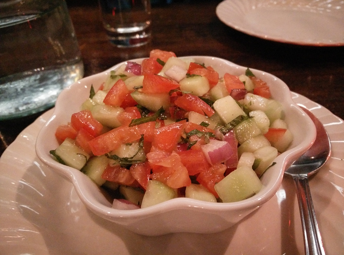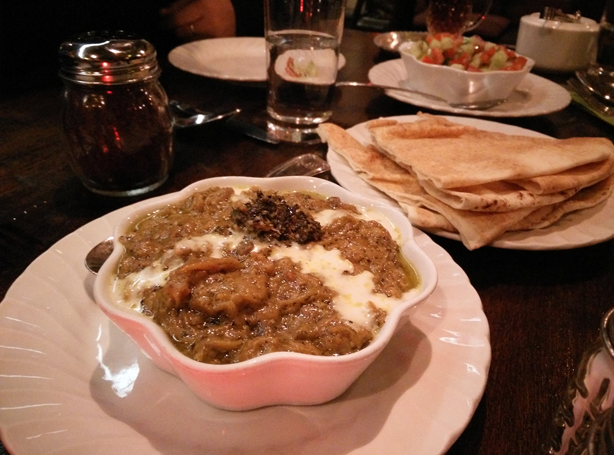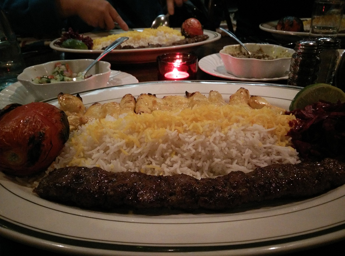 in the evening - on the advice of my sister - we went to sabzi a persian restaurant in arlington. 4 please. do you have a reservation? are we supposed to have a reservation? yes, usually. but we were there early enough that they still managed to seat us among the various empty tables. i never had persian food before, but figured it was some variety of middle eastern. the kabobs caught my eye and i ordered the persepolis, with 2 skewered meat variety i couldn't read but thought i'd give it a try. my sister got appetizers: a persian salad that was cold enough to make my teeth hurt and sour enough to churn my stomach; and an eggplant dip with hints of mint that tasted like sweet mashed baby food (i couldn't taste the eggplant).