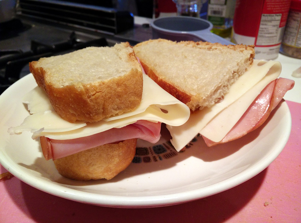 lunch: heated some homemade bread, added some honey ham and swiss cheese and honey mustard. that bread crust sure is enough, one wrong bite and i fear it'd cut the roof of my mouth. but so far so good, i've had a lot of practice with eating, this ain't my first rodeo with tough carbs.