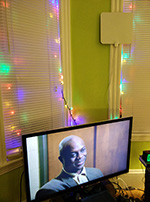 the antenna was bigger than i expected, consisting of a flexible square surface attached to a length of coaxial cable. i stuck it on the vertical trim of my living room window with some blue sticky tack. it may not have to up so high, the best solution would be to hide it behind the television itself. with the antenna,