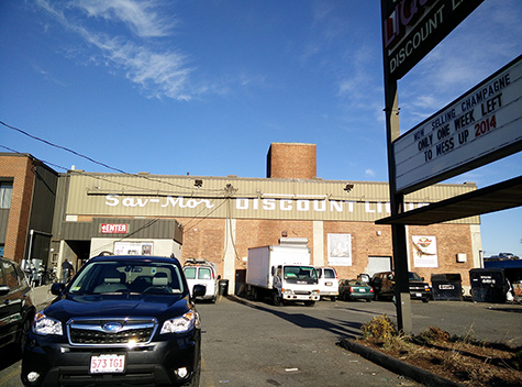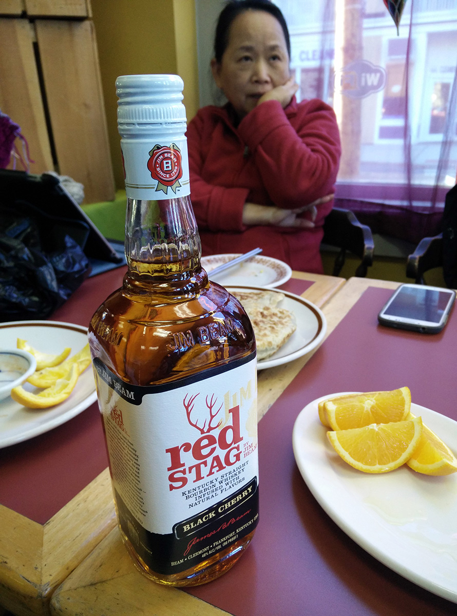 i then headed to the sav-mor discount liquors by mcgrath highway, to get a bottle of flavored whiskey for my mother's birthday which was today. from the outside you'd never guess this place was a liquor store other than the signs, hidden in an industrial-looking brick building by the side of the highway with no windows. liquor stores always make me feel nervous, like i have no right being there since i barely know anything about alcohol. also surrounded by so much glass containers naturally makes me anxious. maybe because i looked lost, someone there asked if they could help me. "do you have any flavored whiskeys?" the woman helped me find a few; their selection was of course nowhere close to what we saw at the new hampshire liquor stores. i went with the jim beam red stag black cherry infused kentucky whiskey ($21.99).