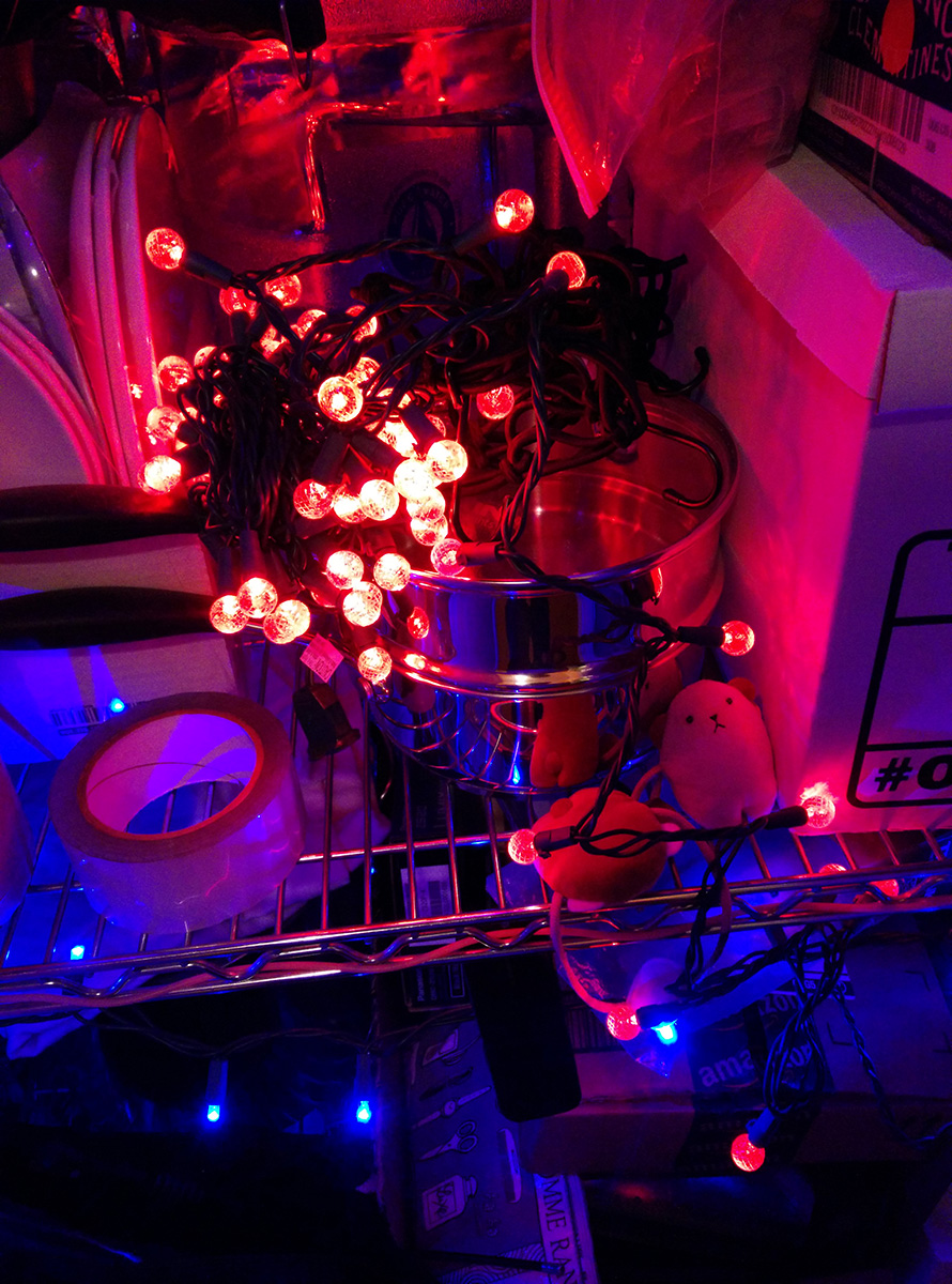 i added the red led lights to my festive storage closet. it's so colorful inside, i'm tempted to set up a comfortable chair in there and use it as a super tiny living room.