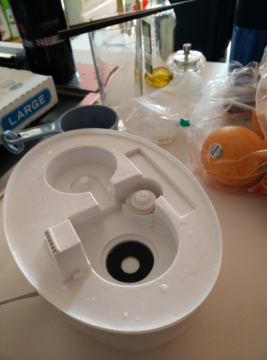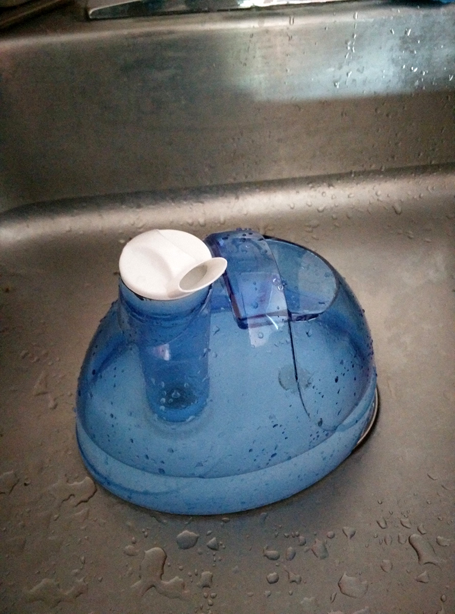the ultrasonic humidifier seems clean enough, but i read it should be cleaned weekly. so i went to the kitchen and added some vinegar and water to both the base and the tank. after waiting 20 minutes for it to disinfect, i refilled the tank and added 4 drops of eucalyptus tree oil. the mist that came out afterwards had a very soothing refreshing scent to it.