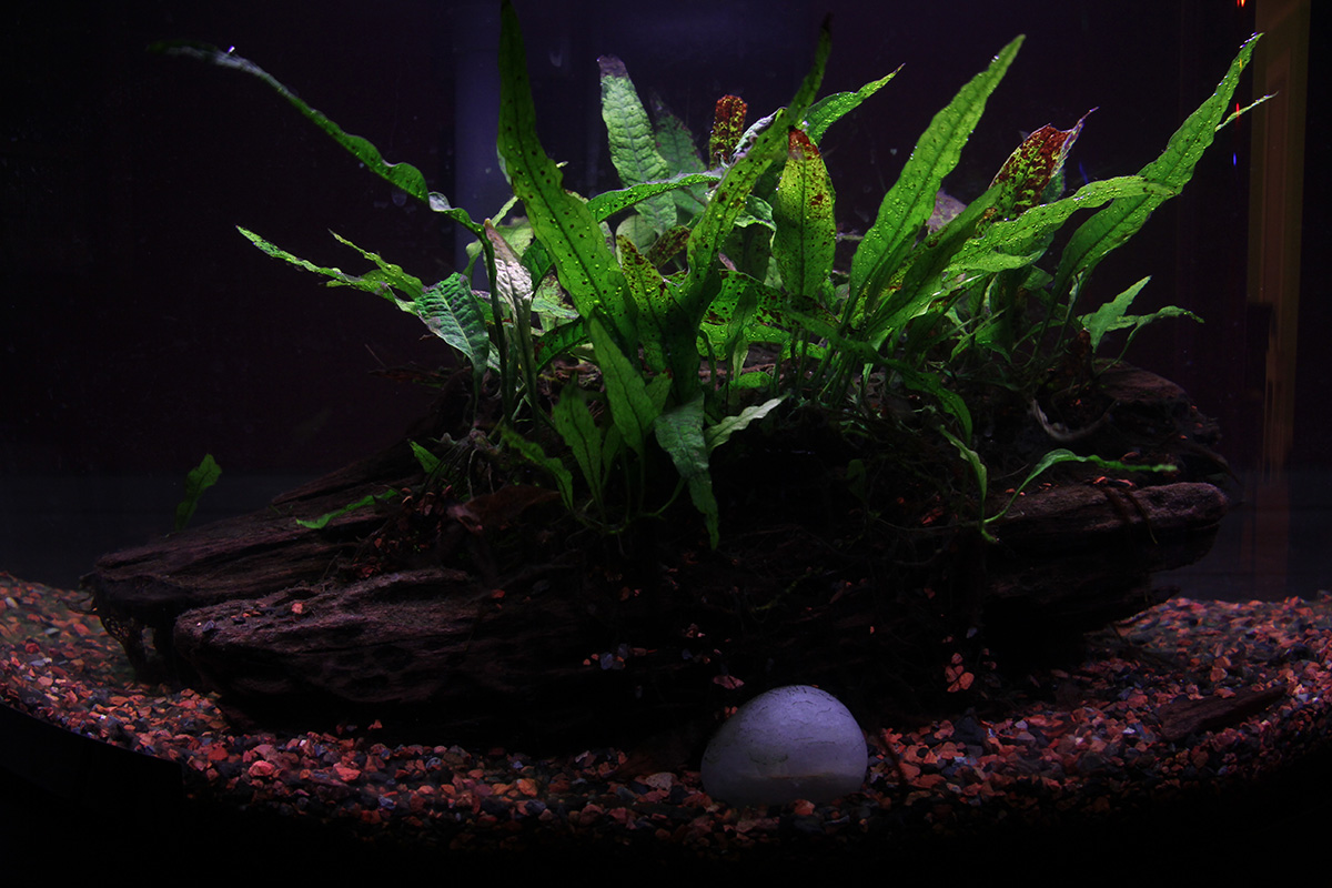 the algae sort of stopped with no fish life to increase the nitrogen levels. i added some plant fertilizer, hoping to rebound the java ferns growing inside. i think the problem has more to do with the light source, a fading 14 watt fluorescent tube sitting in a crumbling light strip. i'm looking to upgrade to LED's, but i'm trying to find a suitable light strip that will fit the width of the 7 gallon tank (15" across). if wonder if it's easier just switching to a standard 10 gallon tank (i have several in the basement); but the minibow just looks cooler with it's convex front end (looks bigger than it actually is).