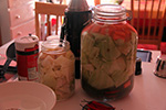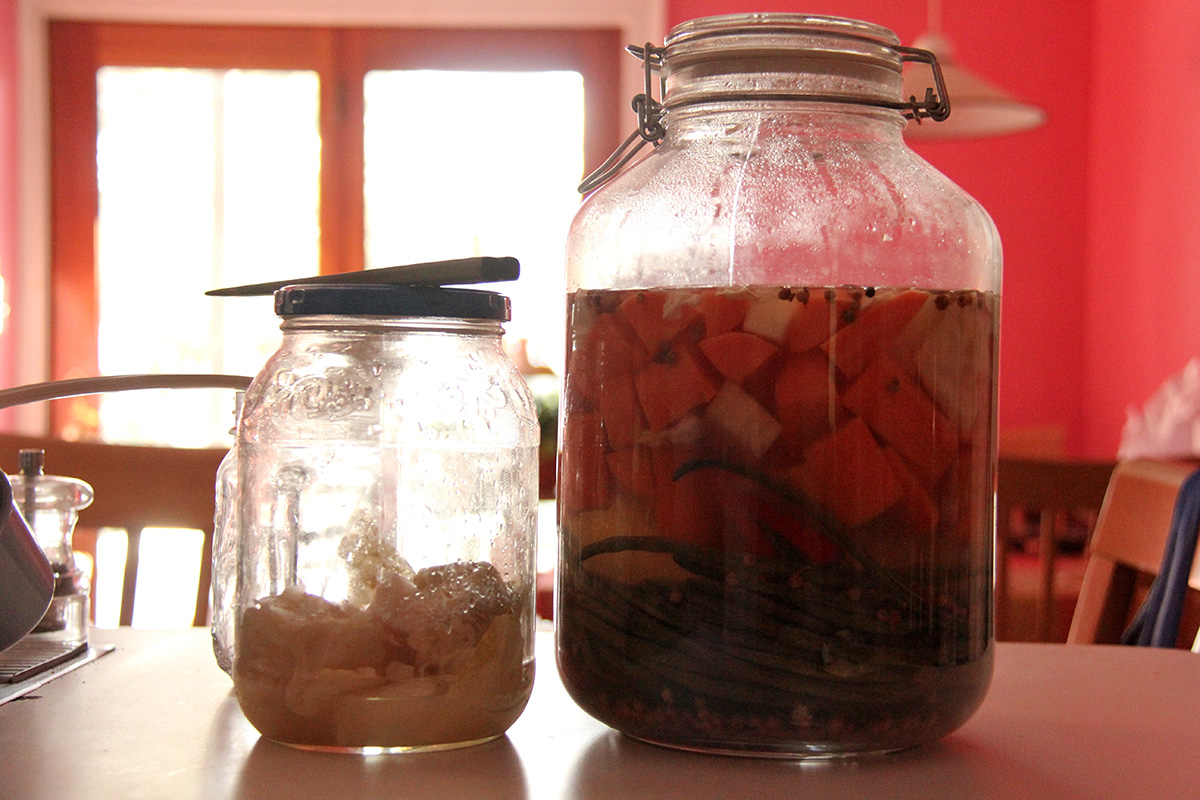 so i added about another tablespoon of fine salt just to give it more flavor before adding the cabbage. there didn't seem to be enough liquid until i crammed most of the carrots back into the jar. but i ended up having some cabbage left over so i decided to start a smaller fermenting jar, adding some sichuan peppercorn (my old stock, not sure if this would even work), thai hot chili peppers (thawed), 1/4 cup of chinese baijiu, and boiled water that'd been cooled to room temperature.