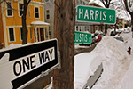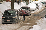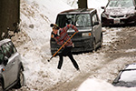 when cars weren't coming down the road, it was actually sort of quiet and peaceful. the only other sound was that of another shovel scraping asphalt, a girl a few houses down doing exact what i was doing, being a good neighbor, clearing out a parking spot. at one point i bumped into dennis, who asked if i could take a few photos of him (using his nikon dSLR) as he climbed the huge snow pile by the street signs. later i got a chance to climb up there as well. the view is pretty nice, not a bad place to just hang out and watch the traffic go by.
