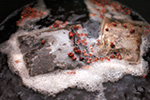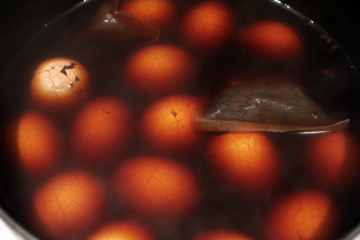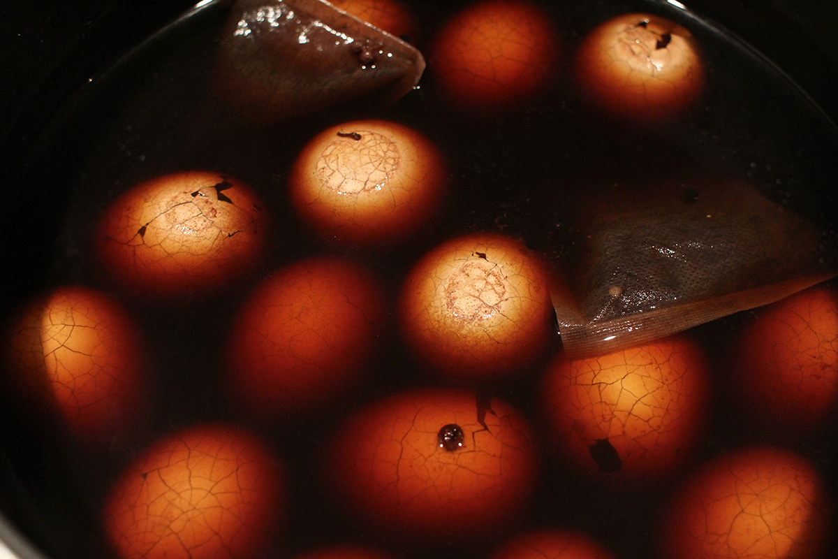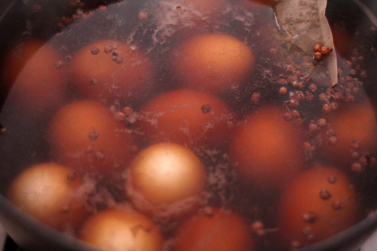 while i was cracking the eggs, i reboiled the water, this time with the 2 tea egg packets (purchased from chinatown a few years ago, one bag filled with tea, second bag filled with spices), some old sichuan peppercorn (about a tbsp) and a tsp of salt. once the eggs were all cracked, i put them back into the pot and let everything simmer for 3 hours. sometime during the simmering i added another tsp of salt (my notes from last time said the eggs weren't salty enough). afterwards i turned off the stove and let the eggs steep overnight.
