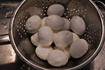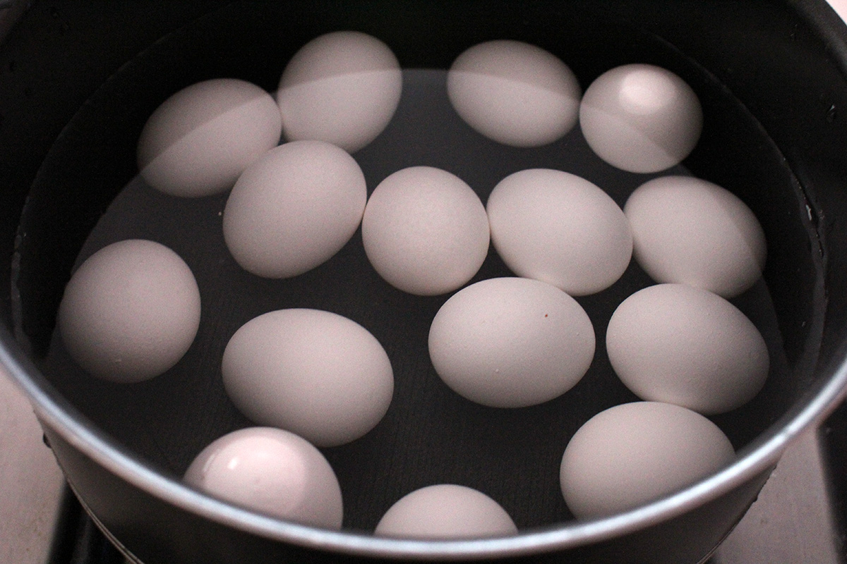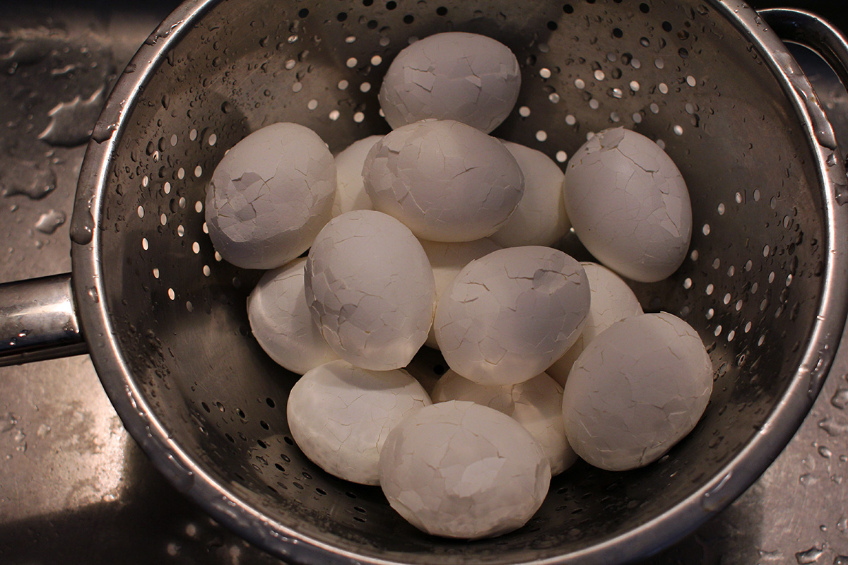 i started by boiling the 15 eggs (3 leftovers plus a dozen new) in cold water with a tsp of salt. once it began boiling, i left it boiling for a few minutes (i remember my mother telling me not to cook them too long) before taking out the eggs. i rinsed them off with cold tap water and began cracking the shells to get that distinctive tea egg marbling effect.
