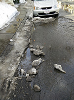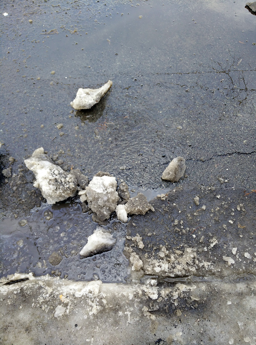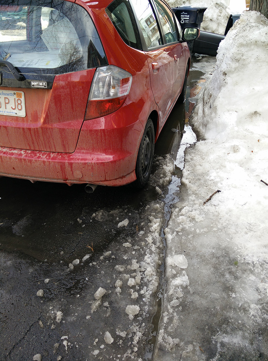 temperature today approached 60°F. i could hear the sound of melting snow everywhere. a pool of water had collected on one side of the street, blocked by some unmelted ice from reaching the drain a few houses down. i decided to help things along by chiseling out a canal with an ice chopper. i chatted with a meter maid who was ticketing a little red car parked in front of my house.