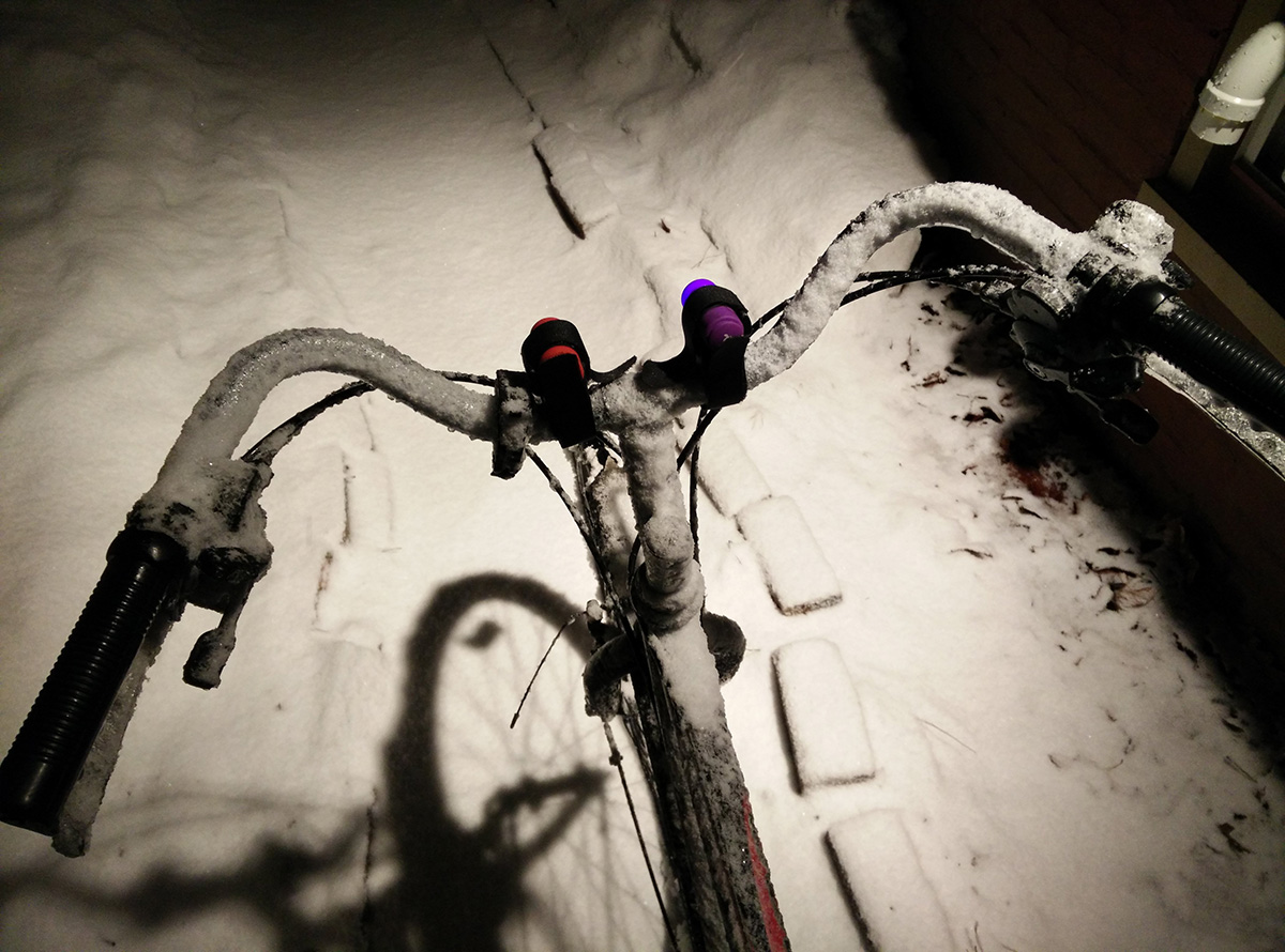 the seat was all iced up and i was nearly home before my shifter thawed out enough to properly change gears. breaking was tough too, with ice gumming up the pads. underneath, i could hear the grinding of frozen snow underneath the tires as i slowly pedaled home. i stashed the bike in the basement to let it thaw out, shoveled the sidewalk just a bit, before finally going inside.