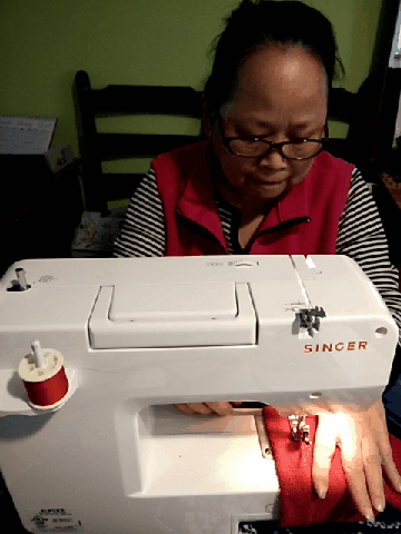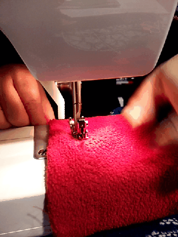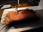 i brought up the singer sewing machine from the basement, which i had used since march 2011, almost 4 years ago. i was a little nervous because i haven't used the machine in a while, so i found a little piece of fabric and practiced sewing a line of stitching. with that out of the way, it was time for the real thing. after measuring and cutting out the correct rectangle of fur, i flipped it inside out to do the stitching. the first one was easy, along the natural edge of the material, using a wide zigzag stitch pattern. the second stitching was in the middle, and i'd forgotten to comb the fur away from the stitches, so when i was done and flipped the pouch right-side-out again, all the fur on that edge were folded into the stitching. single there was still some room inside the pouch, i stitched another line using a simple dash stitch to pull together the seams.