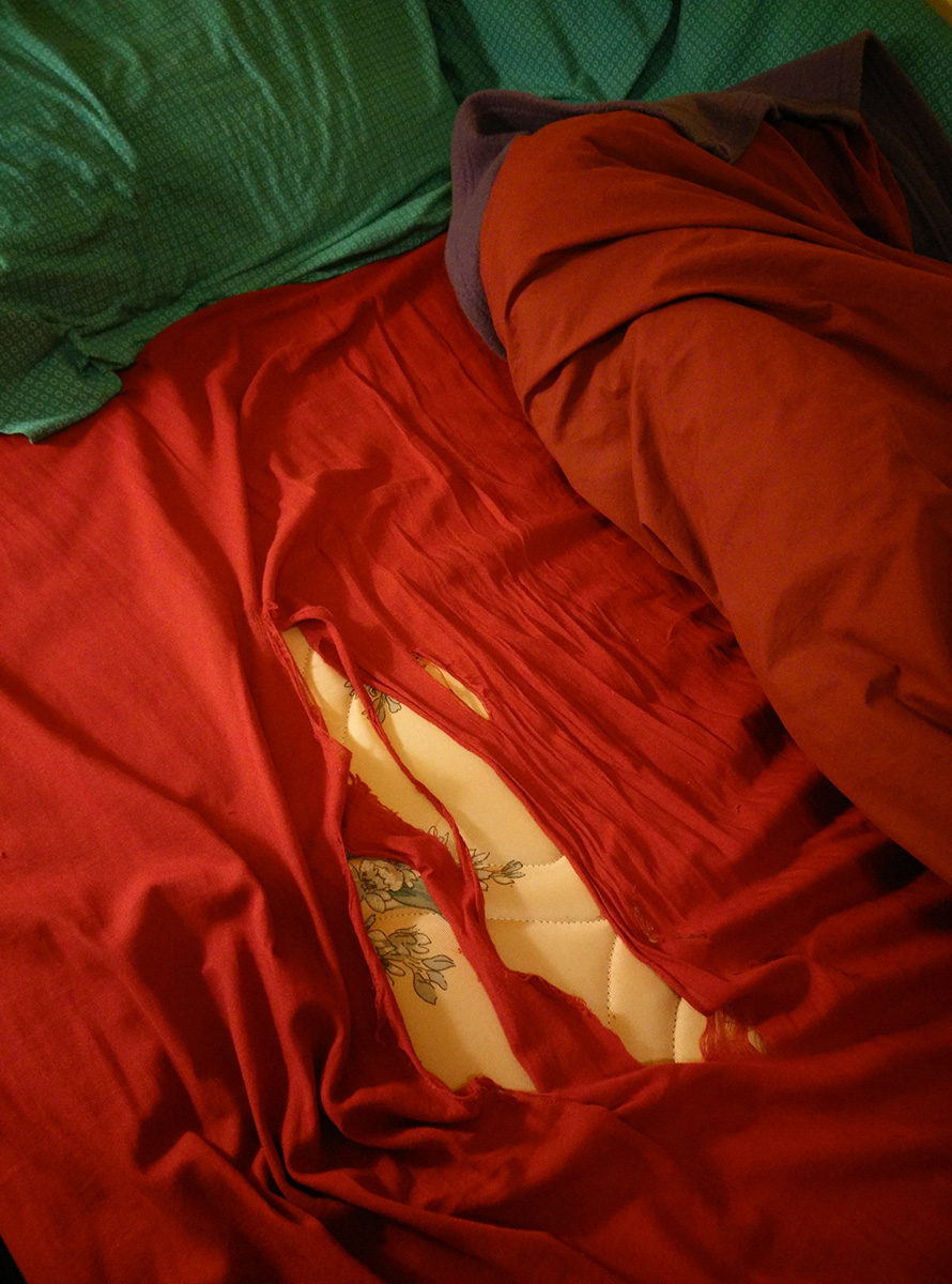 i finally figured it out: the mystery of my perpetually ripped bedsheets. i discovered that when i sleep at nights, i have a tendency to roll to one side of the bed and pull on the other side. not sure why i do this, and not sure why i just found out about it. anyway, this nocturnal activity has the tendency to rip the bedsheet over time. in the meanwhile, i'm looking to buy new sheets.
