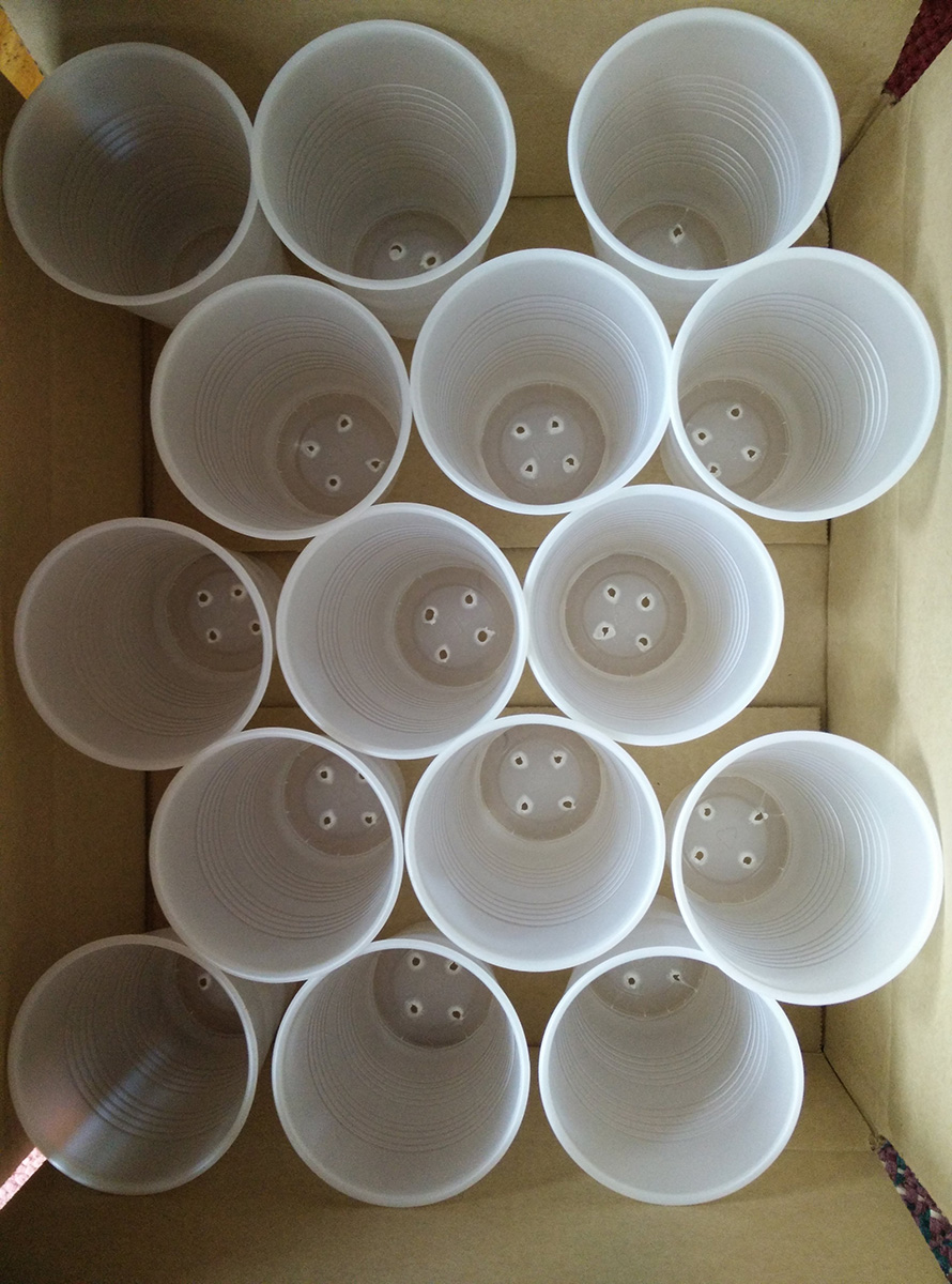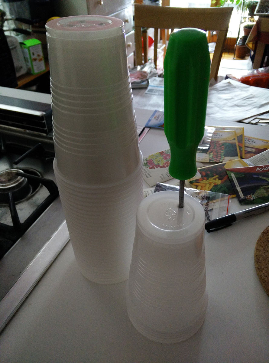 i created some more plastic growing pots. after checking my notes, i realized i used the awl trick before, except when i did that time, i didn't heat the awl. turns out heating is entirely unnecessary. just the friction of the awl turn generates its own heat; hard to get started, but once it drills down, it gets easier as the awl warms up. this is also good because i don't inhale any toxic melted plastic fumes, and afterwards i don't have to scrape off any metal burrs. once that was done, i filled the pots with potting mix.