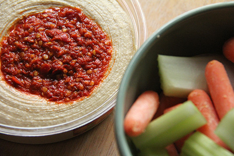 i had a tasty snack of spicy hummus with baby carrots and chopped celery. there was actually a lot of hot pepper paste, not just the surprise, and the hummus itself was genuinely spicy in a very good way. i find hummus sort of bland, i prefer tzatziki (with pita bread) or tabouli (with melba toast). but if i was to get a hummus, i'd get this spicy kind for next time.