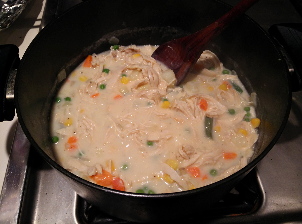 i boiled the potato cubes in one pot (about 10 minutes) and the chicken breasts in another (10 minutes as well, checking to see that the insides were no longer pink). last time i added way too many ingredients and the pot pie was nearly bursting. i used just half a potato since it corresponded to a cup, but i really could've used the whole potato, there was enough room. besides, after boiling for so long, the potato sort of crumbled. after i took out the potato, i added the frozen vegetables into the pot to simmer a bit. i don't know if that's even necessary, considering the pot pie will bake in the 425° oven for 40 minutes. i made sure i added enough salt this time, and tasted the filling before pouring it into the pie crust. recipe called for milk but used half & half simply because i had some available.