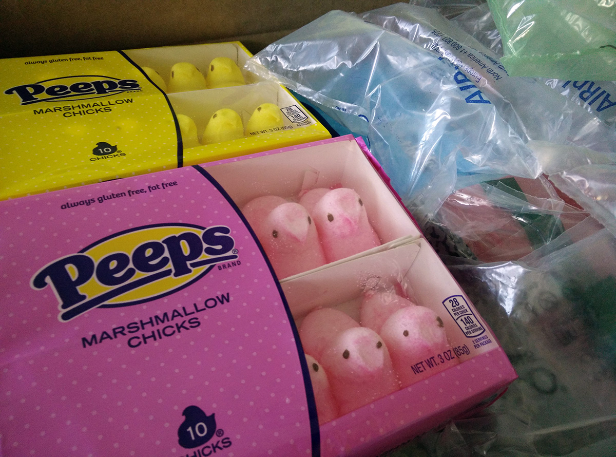 this morning i packaged up frances' latest norwegian shipment. i went in the basement to find a large enough cardboard box but they were all too small. i finally found one big enough in the guest bedroom closet. for some reason i thought it'd be cool to send them some marshmallow peeps as well (i don't think they have those in norway) so i went to rite aid to get some before continuing to market basket to buy some chicken pot pie making ingredients.