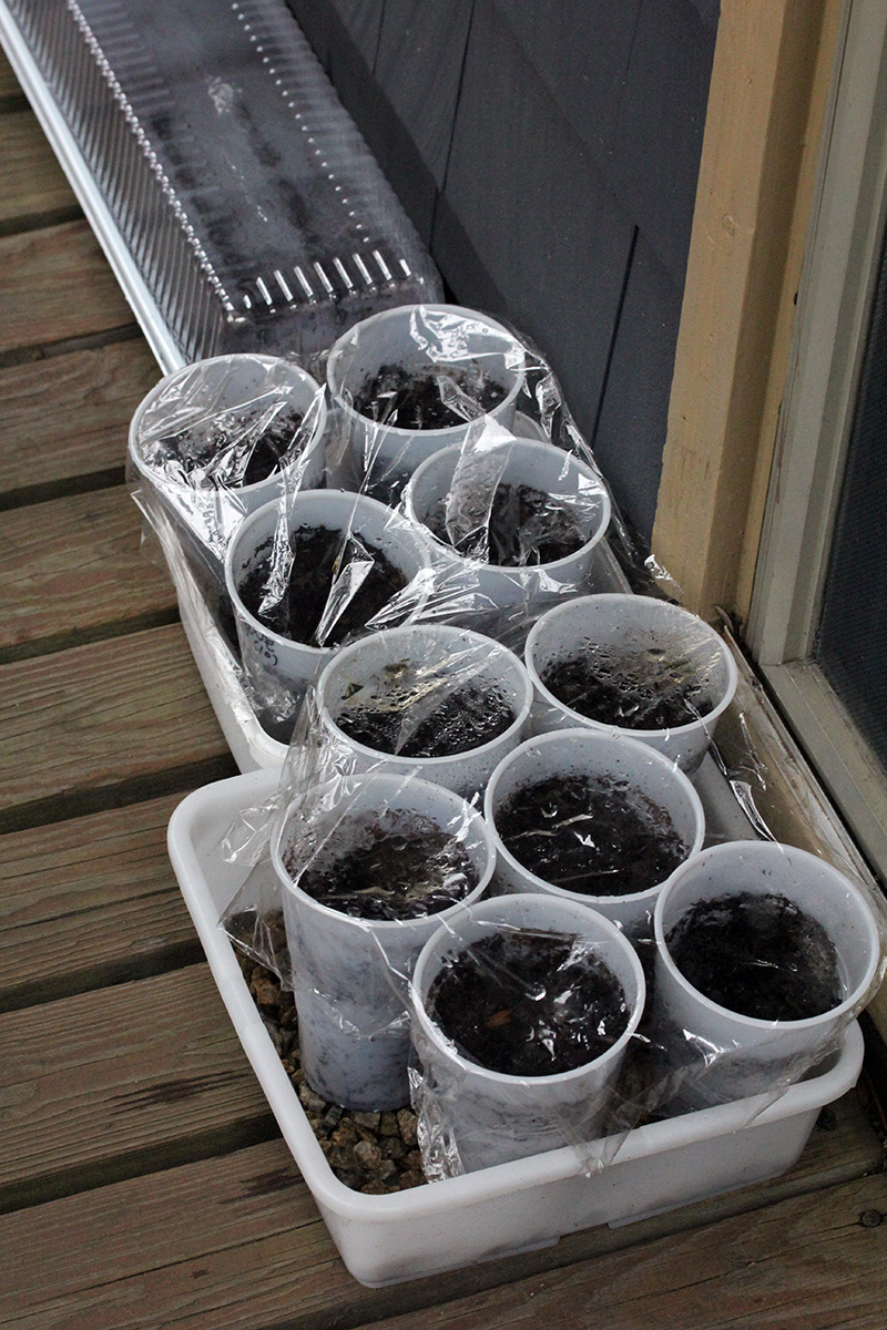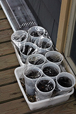 but apparently that wasn't enough. when i went to go water them by reversing soaking in a pail of water, the soil had a hard time retaining the water. the outside was all wet, but the inside was still dry. i ended up having to stir the dirt while i soaked to mix the wet and dry soil together. i also planted 18 small containers of columbine in the self-contained plastic greenhouse. i left it outside to cold stratify.