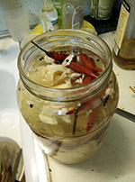 it looked like it might rain so my parents came by to pick me up after work in the afternoon. i brought along a pickle jar of fermented paocai, unopened since i bottled it up more than a month ago. we tried it when we got back to belmont: sour, spicy, salty, crunchy, perfectly blended, but not a lot of carbonation since the jar wasn't airtight. my mother said it was bitter but i didn't taste any of that; bitterness means too much baijiu alcohol, which will disappear eventually while the baijiu breaks down.