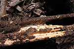 but out of curiosity, i pulled out one of the wooden spikes surrounding the southern facing sun room. they were put there back in 2012 by the exterminator, as a test to see if there were still termites in the ground. they were supposed to come by and check the following year but they never did. anyway, i pulled up the wooden spike and out spilled out a colony of white termites. not good. i snapped a few photos (termites quickly burrow back into the soil after they're exposed) and went inside to tell my father, who came out to see.