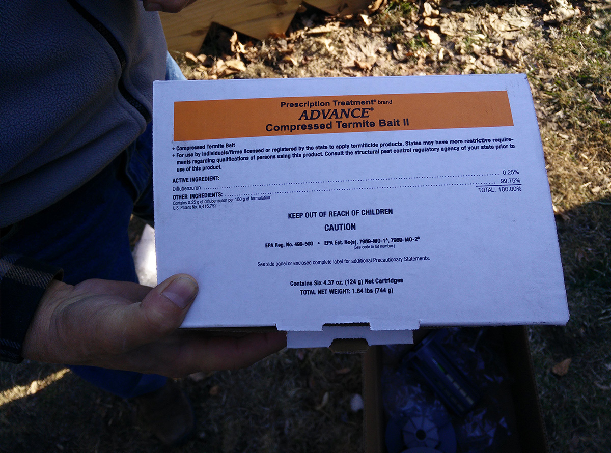 1 the traps he was using were from the advance termite bait control system. i think he said each future appointments to come out and service the traps and add new bait is $80/visit, but the bait cartridges are available for purchase online. the active chemical is diflubenzuron, your typical chitin-inhibiting insecticide. it doesn't pose a high risk to mammals, but does to insects and aquatic life.