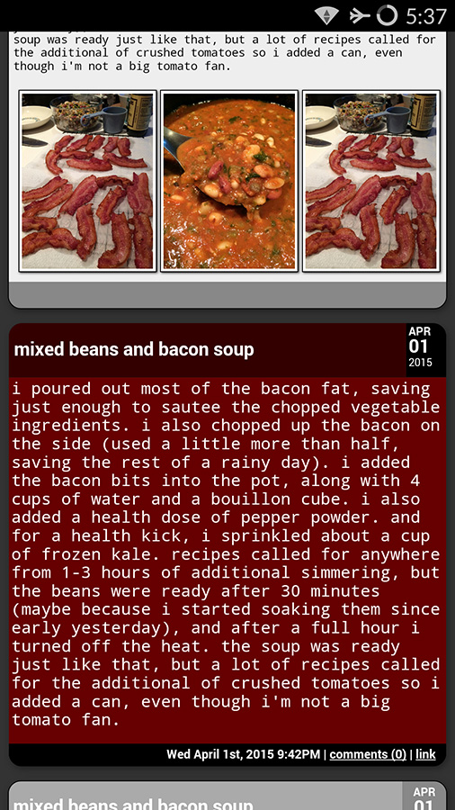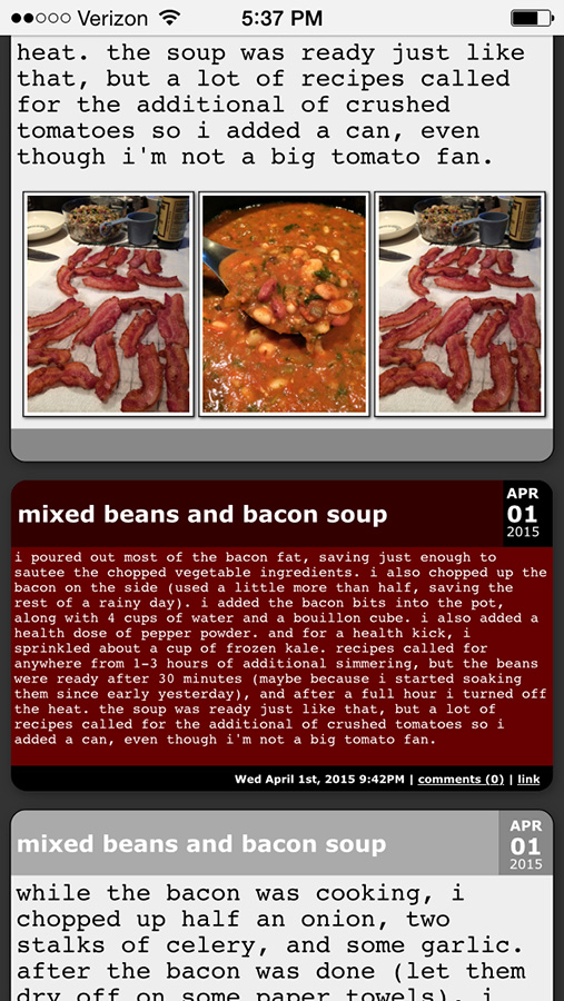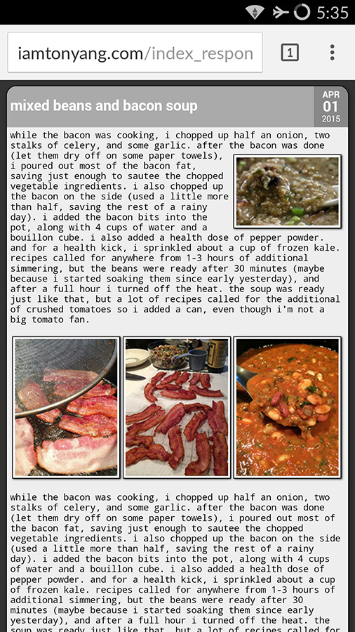 i've become obsessed with responsive web design. since yesterday i've been working on streamlining my weblog, particularly how each post entry is laid out via the stylesheet. i used to do it with tables, but at one point i upgraded to divs. but the div layout i'm using is a real mess, pieced together through trial-and-error and luck, and there are parts i don't even understand how it works. the thing i was working on today was understanding the difference between absolute and relative divs. i still can't quite wrap my head around, and i'm mainly trying to self-teach through trial-and-error once again. i was testing between the 3 main browsers on the pc (chrome, safari, firefox) then chrome on android and chrome/safari on the iphone.
