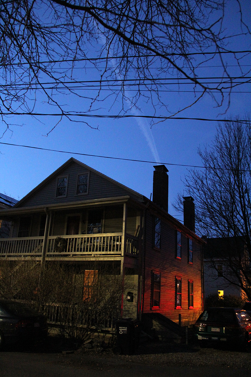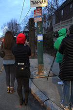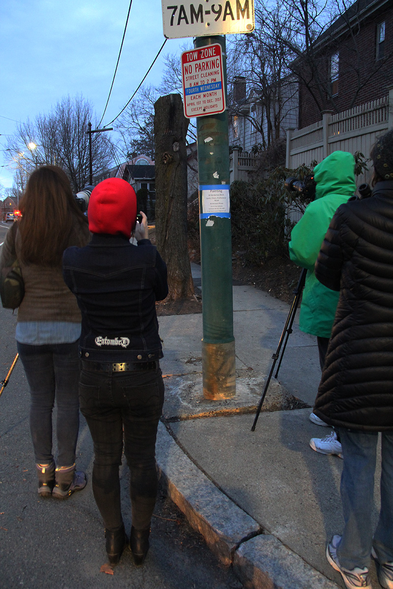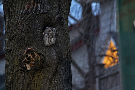 i left for cambridge a little after 7:00, right around dusk. riding down huron avenue, i saw a crowd of people at the intersection with larchwood drive, across from the fresh pond reservoir. i'd seen people before, last sunday when i was going home. i was curious what they were looking at, with their binoculars and telescopes and digital cameras. it could've been one of two things: something astronomical, or something bird-related. i saw the crowd again tonight and just had to stop to see what they were looking at. turns out it was a small owl sitting in a tree hole - an eastern screech owl to be exact. people were waiting around hoping to catch a glimpse of it flying away to look for dinner. owls sleep during the daytime but once it gets dark, they slowly wake up in search of food. when a noisy fire engine came roaring down the street, the owl seemed to have had enough and quickly flew away.