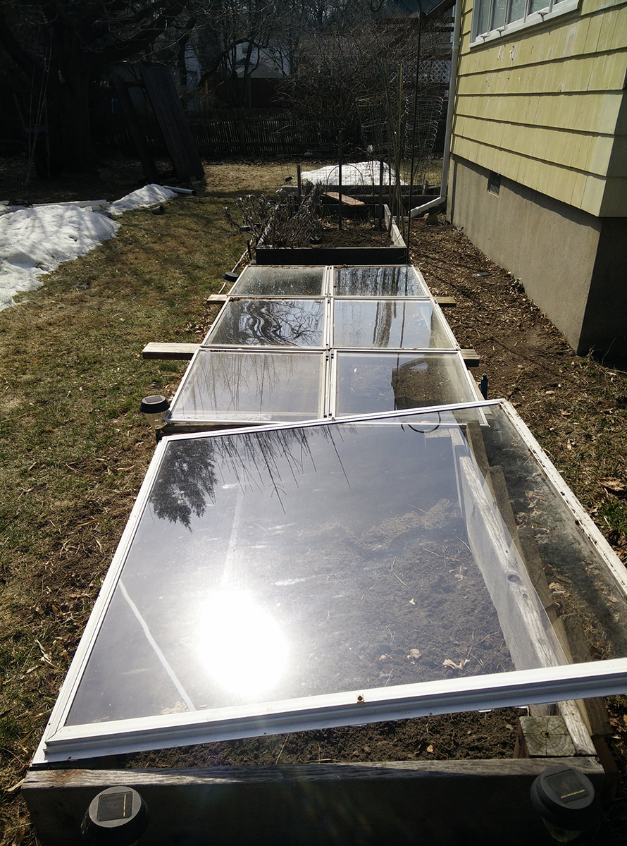 i envision a lot of belmont gardening work while my parents are away. tidying up the backyard, fertilizing the lawn once all the snow has melted, plant some early spring greens in the raised beds, dig out the runaway bamboos, set up the rain barrels, rabbit-proof the fences, etc. once my parents return, my father and i will chop down the 2 diseased plum trees and repair a section of fence that's falling apart. i took some time to set up another cold frame using leftover storm windows from when my parents upgraded their windows last year. while moving a wooden plank, i drove a thick splinter right into my thumb. it was painful, i yanked it out, but for some reason it didn't bleed.