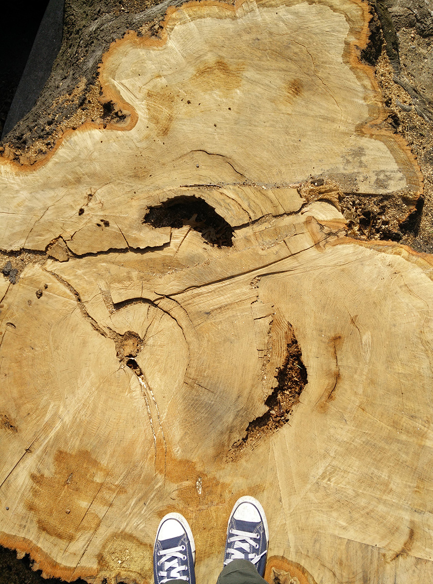 enroute to belmont via bike, i stopped to take a photo of the massive tree stump on linnaean avenue. it wasn't that long ago that i was admiring the many tall trees on linnaean, some seemingly dangerously tall. i guess i wasn't the only one paying attention because they chopped down of the trees a few weeks ago. if i'd known i would've checked it out, it must've been a real spectacle. the tree still had that fresh turpentine smell and the stump was still wet with sap. that tree was easily 100+ years old.