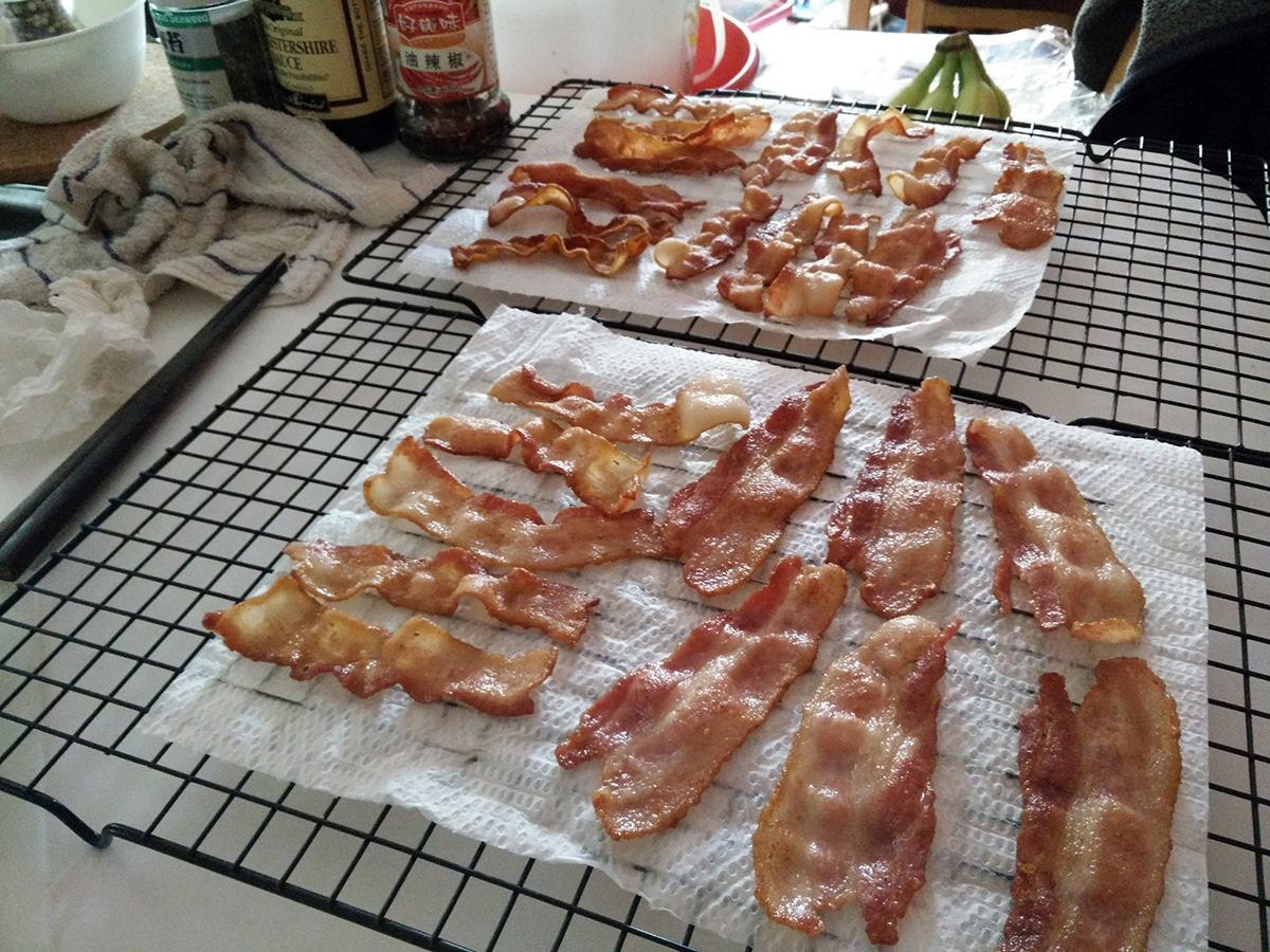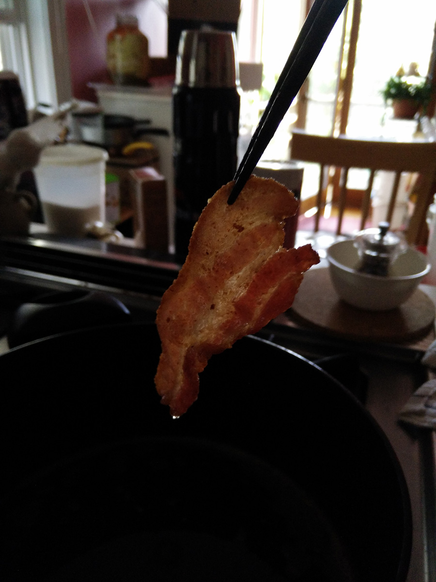 i didn't need a jacket, just wore a long-sleeved shirt. i bought a package of bacon that i'd later cook when i got back home. had all the doors closed, the windows and back door opened, and two fans blowing to vent out the smoke, quite the spectacle. nowadays when i cook bacon, i cook the whole package. i use a tall pot to contain the oil splatter, and a splatter guard as well.