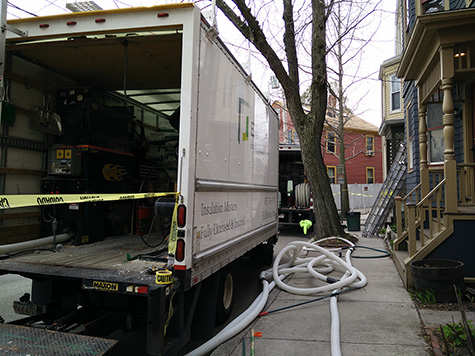 a team of a dozen contractors arrived in two trucks (4 young white north shore guys and 2 brazilians). i was told normally they'd send out just a single truck, but one of their jobs got cancelled so they both showed up, hoping to get everything done faster. jim went over what they planned on doing today: seal the rim joist in the basement, pop out shingles so they can drill holes to pump in insulation material (cellulose), and insulate the door sweep. according to the contract they were also supposed to insulate my ducts, but jim told me that wasn't a part of their work order, and the next step living will probably send out their own team to do that instead, since he doesn't know anything about it.