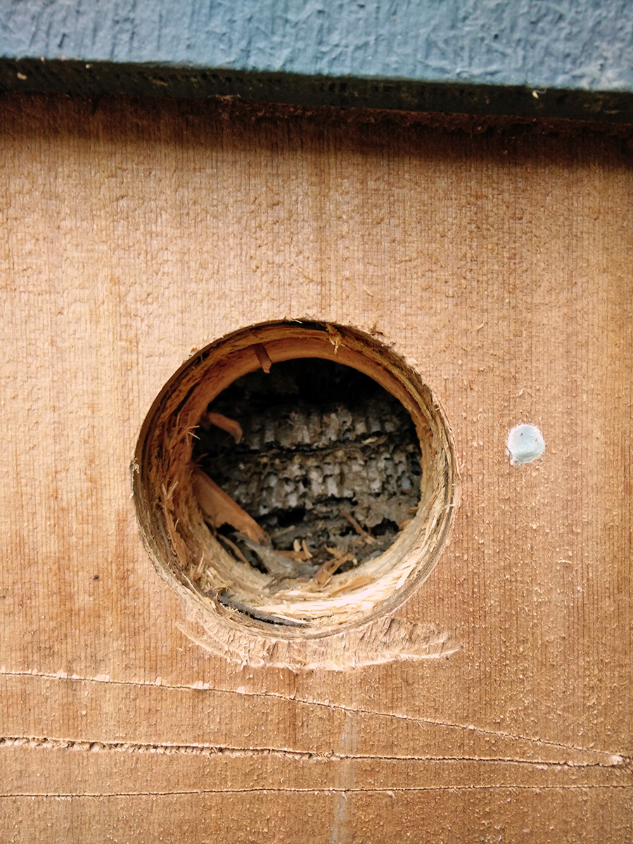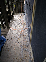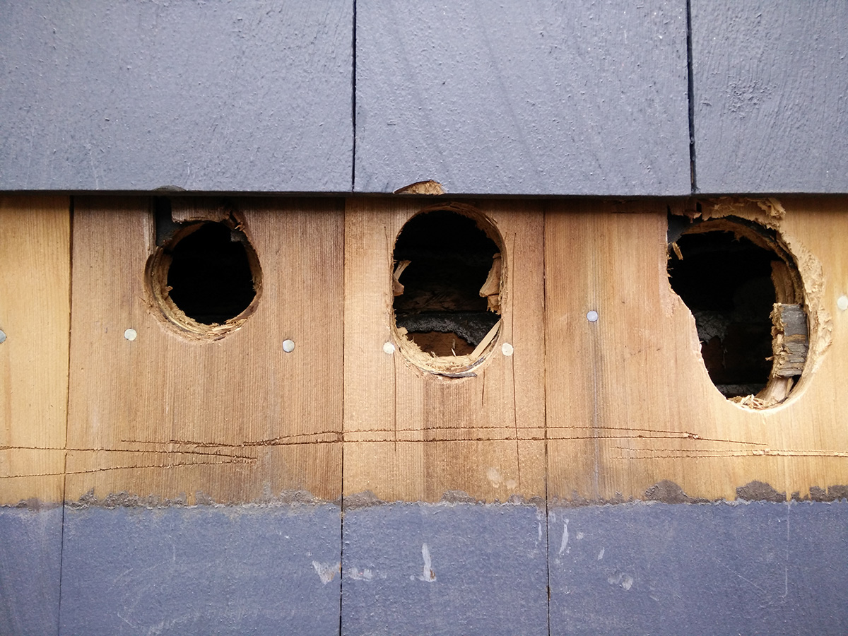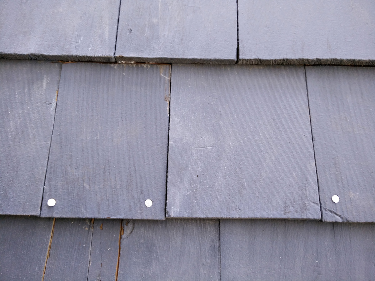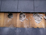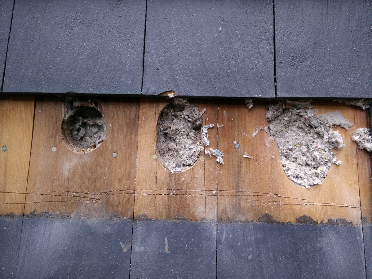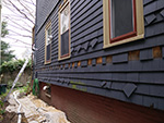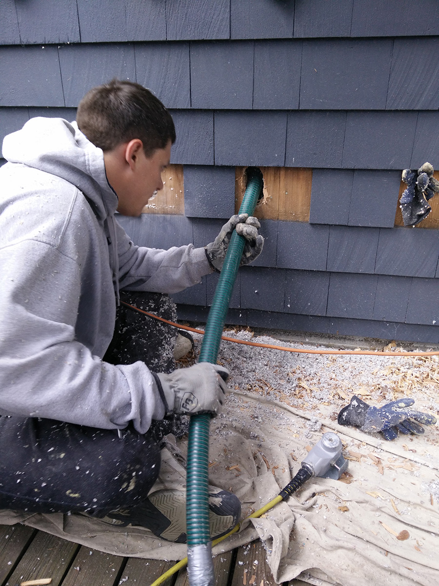 while that was going on, the other half of the team were pulling out shingles. they did that by scoring the shingle with a box cutter then prying it off. they stick the loose shingles underneath a nearby shingle so later on they can nail them back to their original location. shingles actually make their work a lot easier, compared to something like vinyl siding, where you can easily hide the evidence of the work. once the shingles came off, they'd drill into the wall of the house until they got into the space between the exterior and interior walls. that's when they'll blow in the insulation material, a type of cellulose, which looks like paper pulp, but treated with non-toxic chemicals to be fire, insect, and mold resistant.