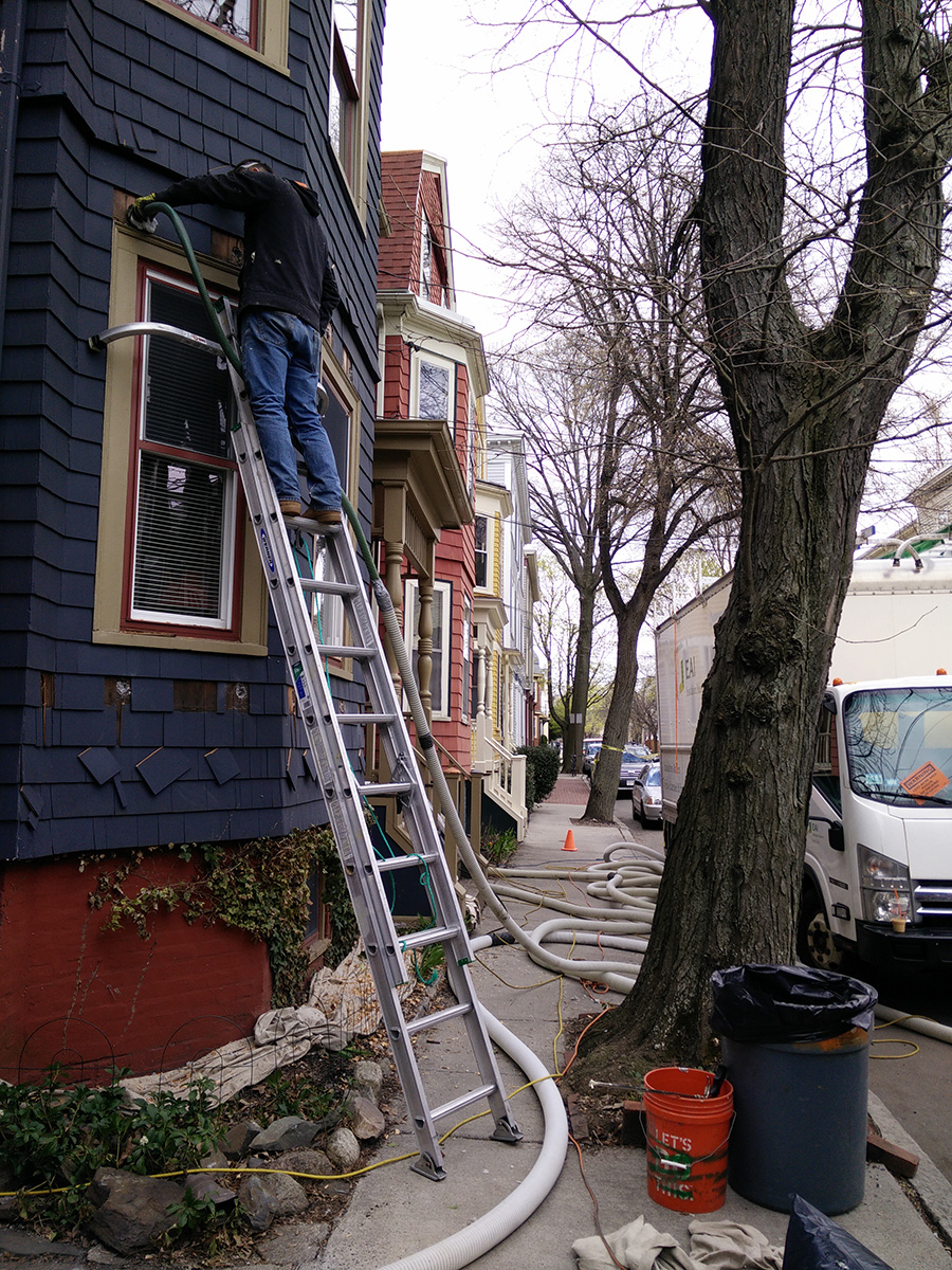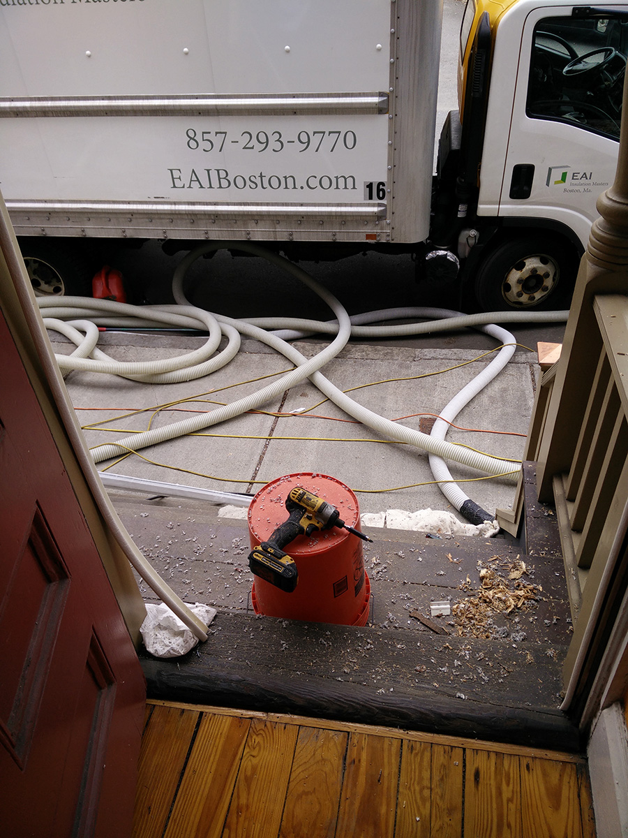 the insulation installers arrived at 7:40, way earlier than they should've (between 8:30-9:00). fortunately i was already up, having slept poorly overnight, anxious about the work being done this morning. i heard the beeping of what sounded like a truck backing up, and when i looked out the window i knew it was them. i was glad they were able to find parking, since i was afraid they wouldn't because we (they?) never applied for a construction parking permit (which cost $100 and had to be submitted 4 days in advance). i went out to greet the person in charge (jim). he asked if i knew who owned the car parked in front of the house, because if it moved there'd be space for their second truck. i called steve who came down a few minutes later to move his SUV.