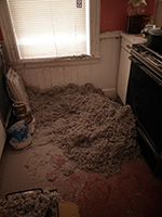 everything was going fine until i went into the house and saw a mountain of cellulose material in my kitchen. it took a few seconds for my brain to register what i was seeing, but i quickly opened a window and told them to stop pumping the insulation. apparently there was a small gap behind the kitchen island counter and also behind the dishwasher. it took one of them half an hour to clean up the mess with a shopvac.