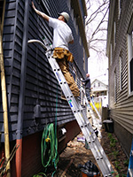 these guys did great work but i had some gripes. i didn't like the fact that the shingles would be nailed back on with the nails exposed. this may be the only way to do it, but i think it looks sort of ugly. the door insulation strips they gave me was a white color, which looks kind of hideous paired with my red door; i'm hoping maybe i can repaint it. with 2 trucks, they also took up a lot of space, roping off margot/don's house as well as renee's place with caution tape. finally, the biggest gripe is the total disregard for my plants. i tried to save as many as possible, moving cables and tubes and equipment whenever i saw them on my plants, and despite my warnings to these contractors, they still trampled on the plants. my poor hostas! but they'll grow back. if only this work had been done in the fall! or early winter! when all the plants were dormant! later when jim was in the house and saw my grow closet, he understood why i was so concerned about the plants.
