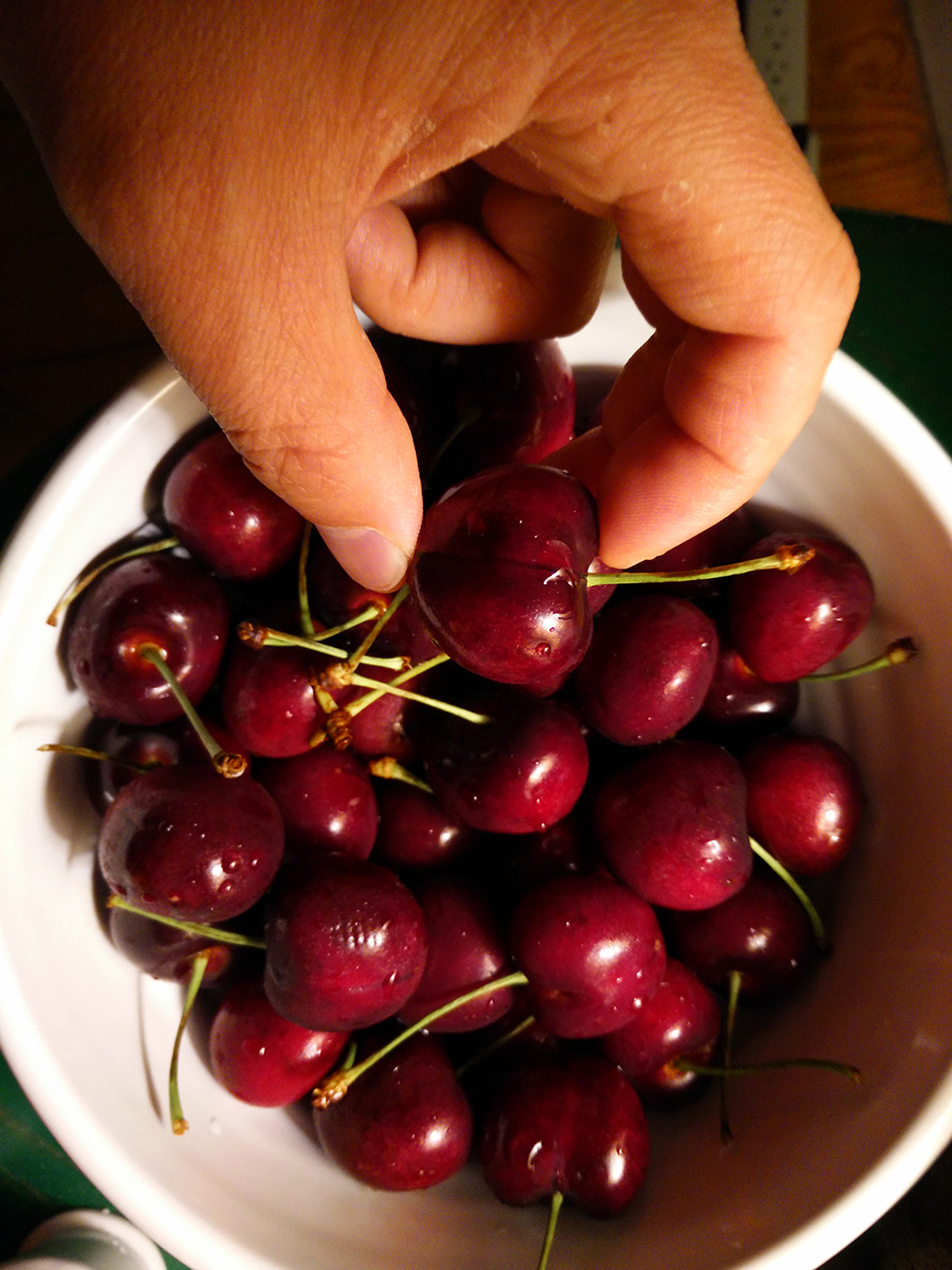 as if continuing on today's theme of getting things done, i brought out my barstool (to stand on) and trimmed some of the low-hanging locust branches blocking my view of the street from my living room window. i then finally went inside to take off my sweaty clothes and have a shower. i finished off the evening snacking on cherries and drinking my southern sweet tea.