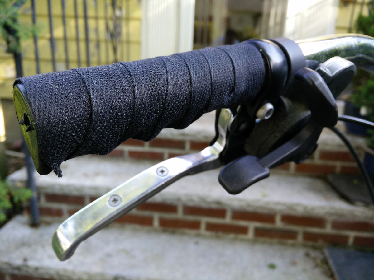 back in belmont, i finally had time to wrap handlebar tape around the vinyl handlebar grips of my utility bike. i got some cheap fabric tape, one roll was enough to do both grips. i've never wrapped handlebar tape before,