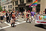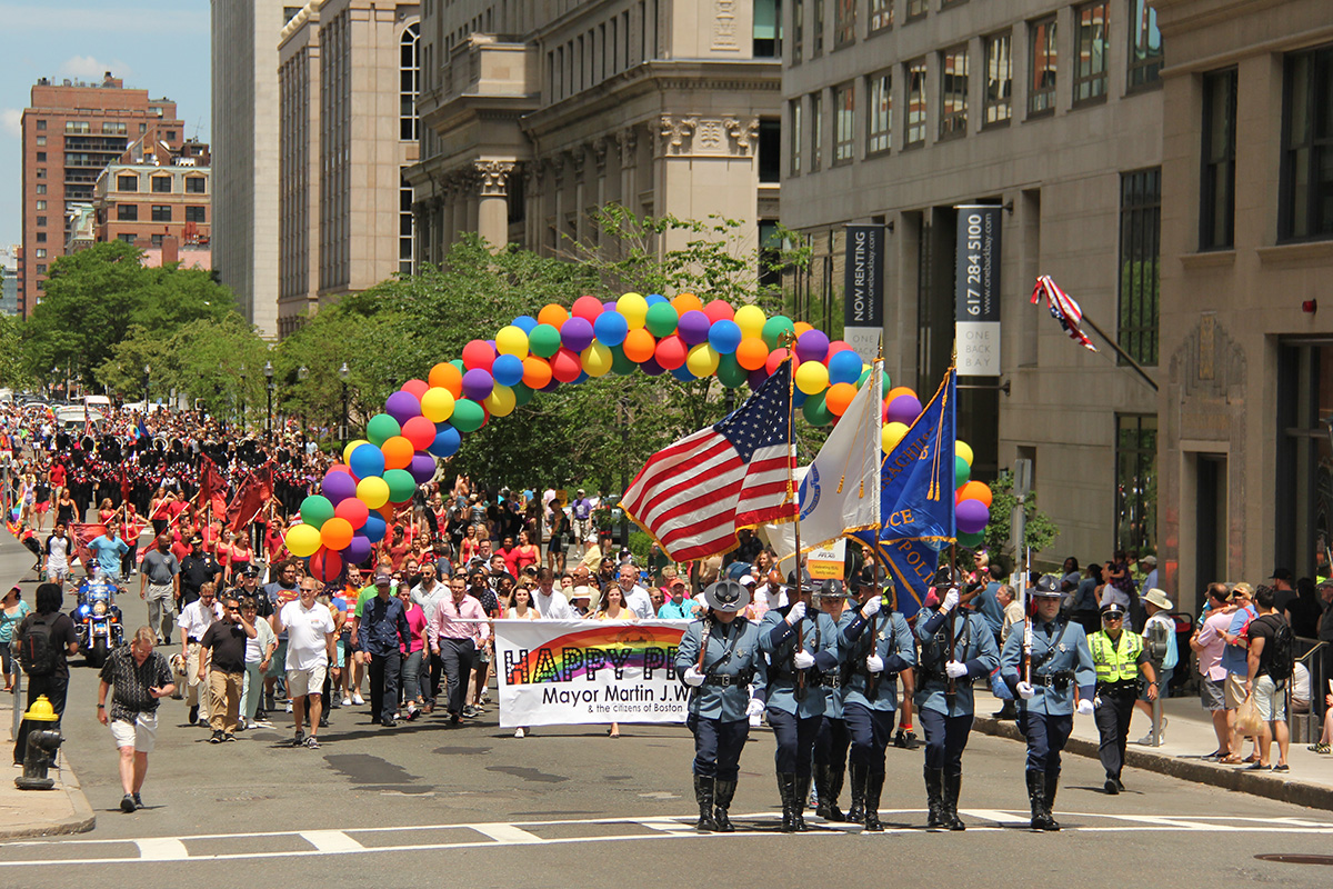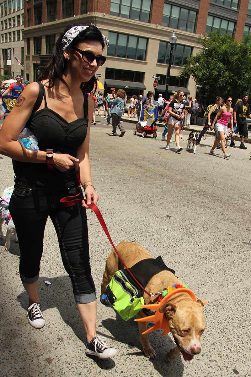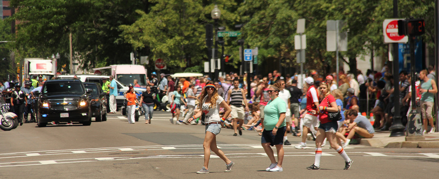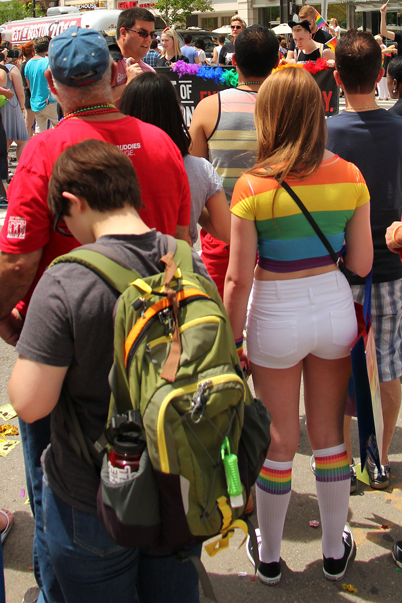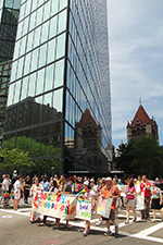 i was hoping to leave early, but i didn't get out of my house until 11:10, with the pride march starting at noontime. it took me about half an hour to get to backbay station, but fortunately there still weren't too many people lined up on the sidewalks yet. a photographer had already staked out the best stop, on top of the hill by a mailbox. i was about 10 yards further down. the weather was pleasant but sunny enough that i sprayed on some sunblock before i left the house.