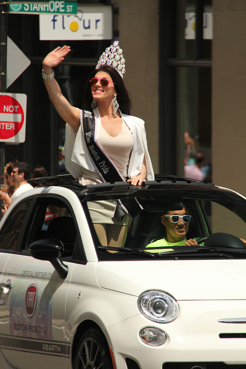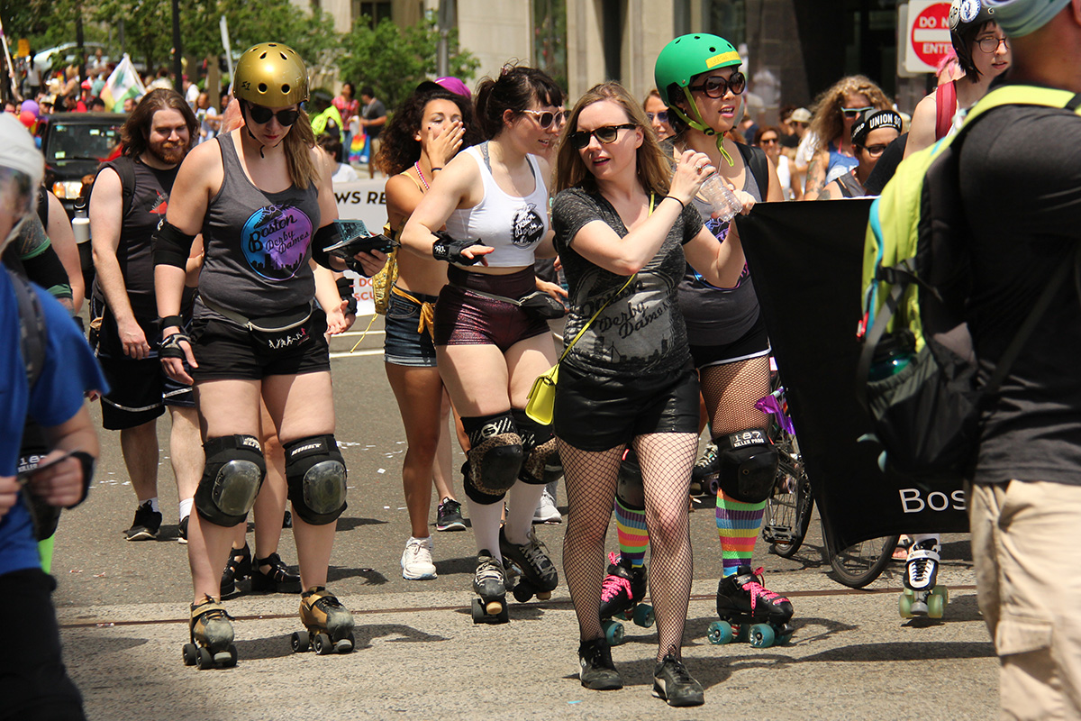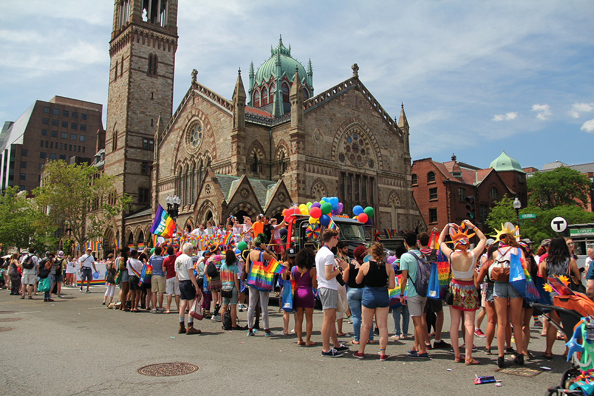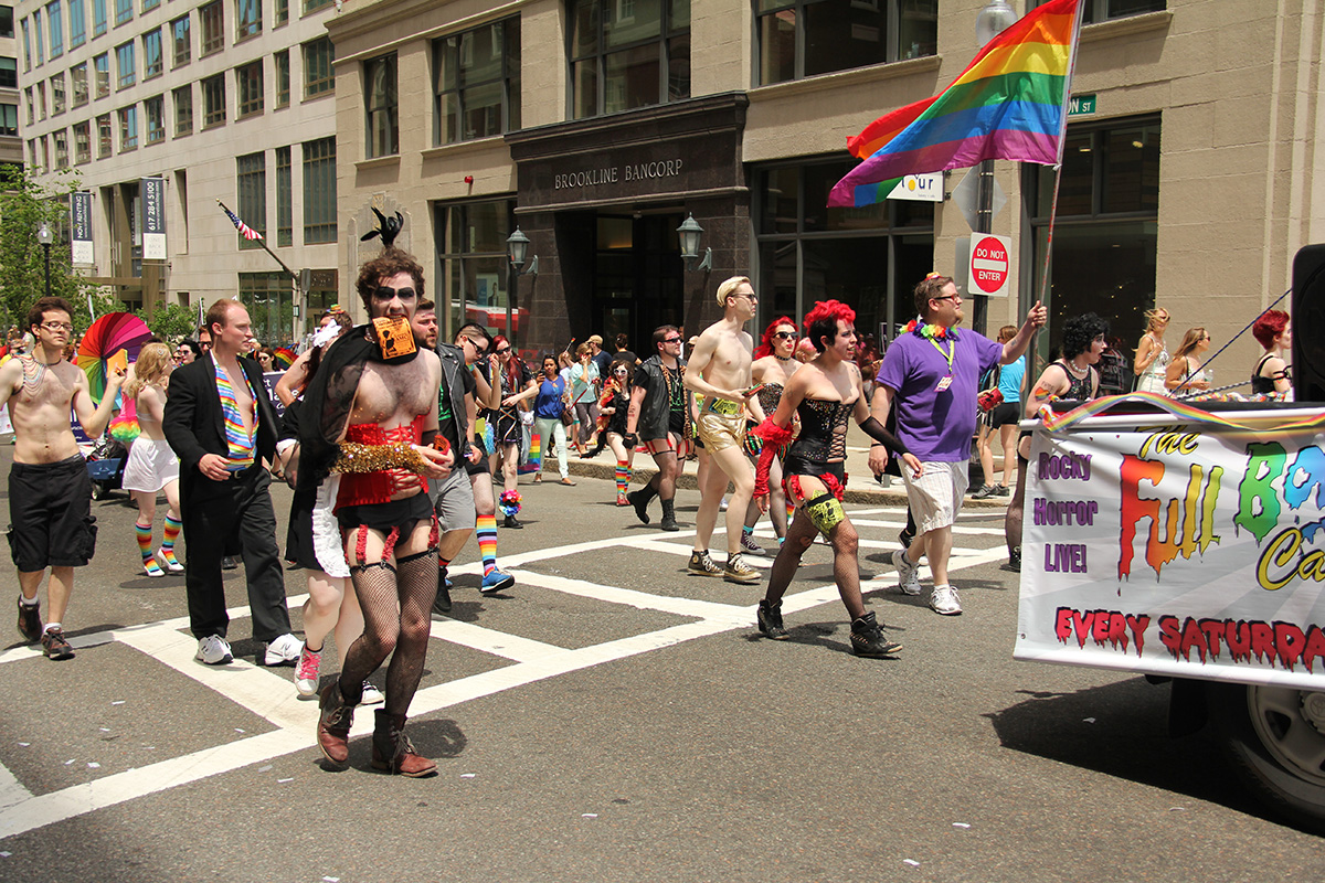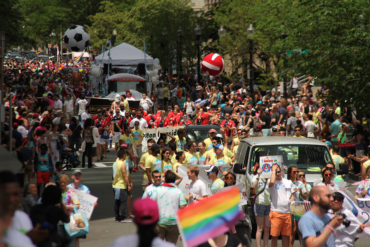 i was hoping to leave early, but i didn't get out of my house until 11:10, with the pride march starting at noontime. it took me about half an hour to get to backbay station, but fortunately there still weren't too many people lined up on the sidewalks yet. a photographer had already staked out the best stop, on top of the hill by a mailbox. i was about 10 yards further down. the weather was pleasant but sunny enough that i sprayed on some sunblock before i left the house.